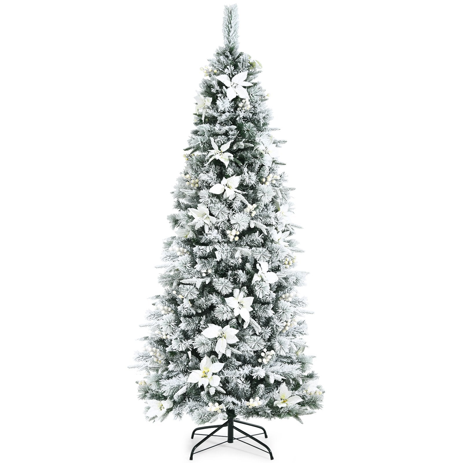 This 8FT Snow flocked artificial Christmas pencil tree features 807 delicately crafted branch tips which can add a warm festival feeling to any setting. And pre-decorated with pure white berries and lily-white flowers the tree is suitable for the Christmas season and looks beaming with charm. Supported by a sturdy foldable metal stand this Christmas tree will keep upright and endure many holidays. And there is no need to worry about installation and storage for it is fairly easy for anyone to assemble the Christmas tree thanks to the convenient hinged design.