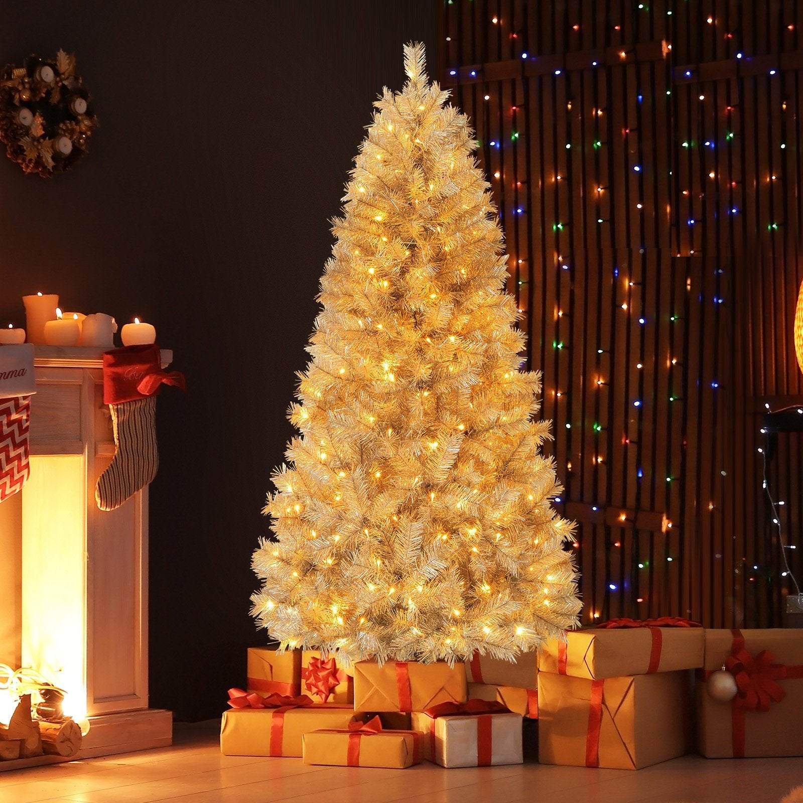 ● Vibrant Tinsel Leaves: The Xmas tree features 385/553/807 branch tips that bring the magic of the holidays. All silver tinsel leaves are designed to catch light and reflect a spectrum of stunning colors providing a merry backdrop for your family gatherings.