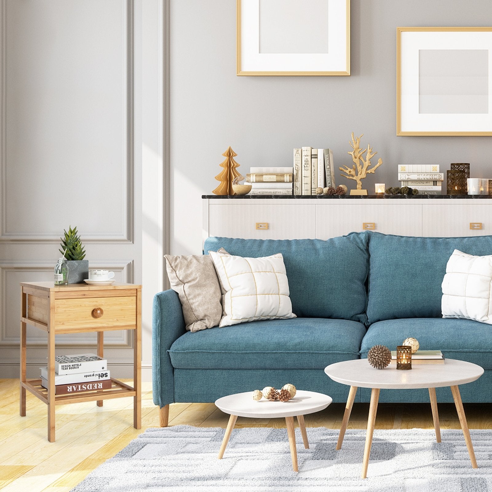 ● Natural Material and Sturdy Frame: The nightstand is made of high-quality MDF and natural bamboo with a durable solid wood construction. The 4 thick wooden legs ensure higher stability with the table top holding up to 66 lbs and the drawer and open shelf up to 11 lbs respectively.