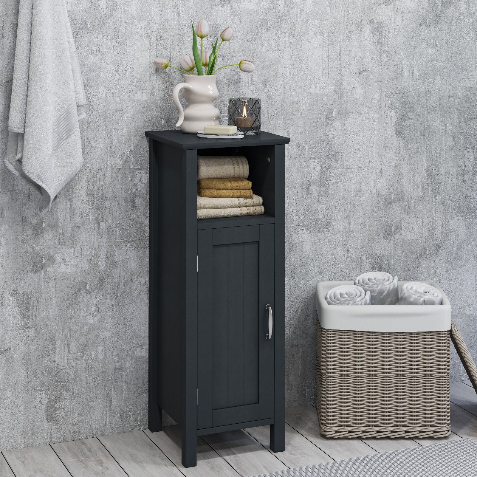 ● Large Storage Space: This floor cabinet comes with a wide cabinet top for you to place items freely. And Its flexible design includes a large open compartment and a two-tier cabinet enabling you to meet all your daily storage needs from toiletries to towels effortlessly.