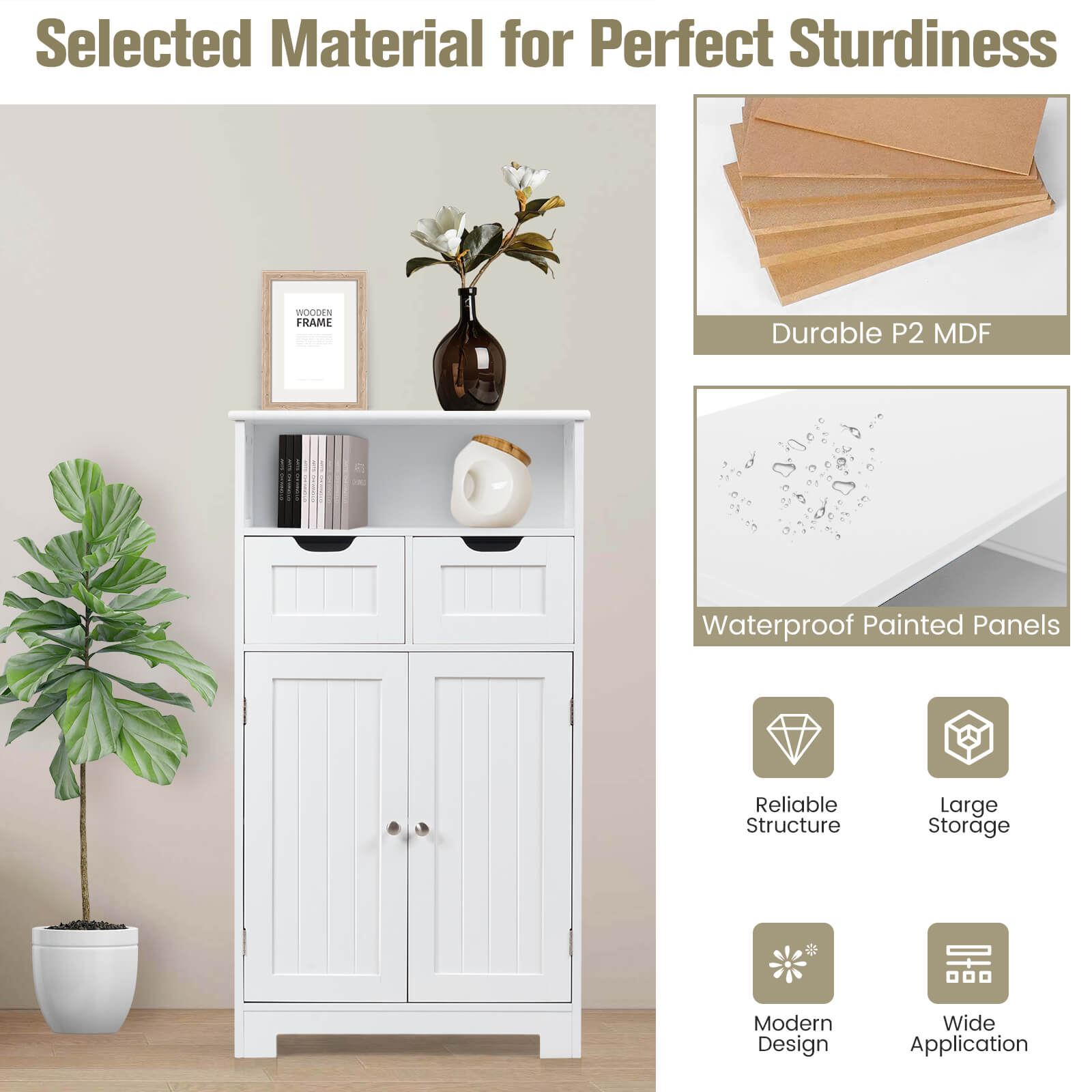 ● Sturdy and Durable Frame: Made of premium density board the floor cabinet is sturdy with large weight capacity. The accessories which come with the cabinet are antirust and will increase the stability of the cabinet. And the surface of the cabinet is treated with coating so that it is waterproof.
