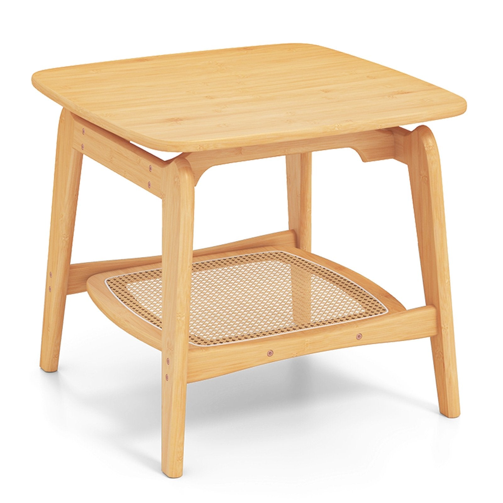 Boho Bamboo Sofa Side Table with Faux Rattan Storage Shelf-Natural