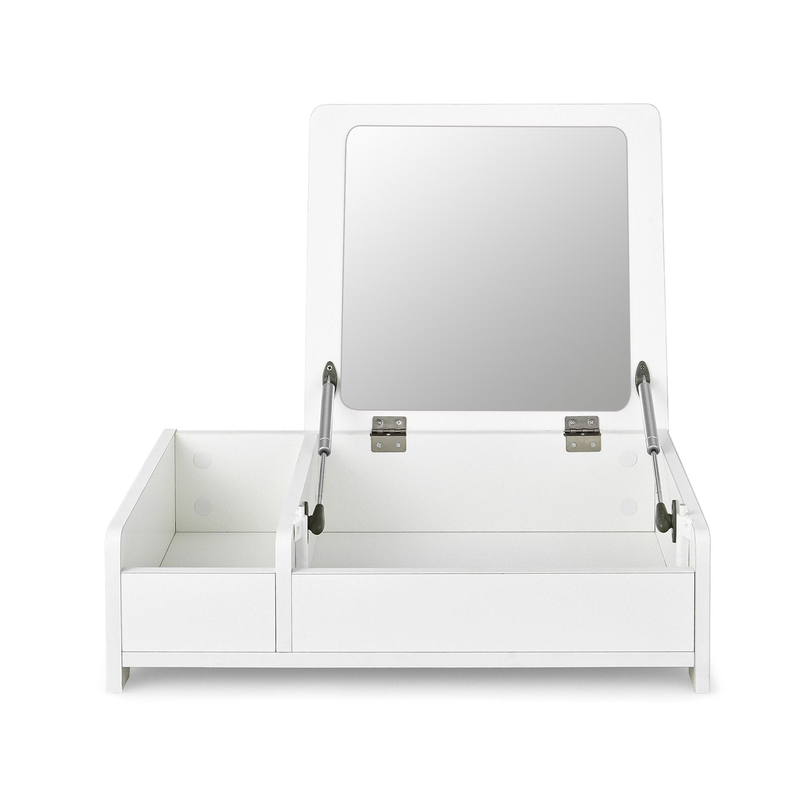● Flip Top Mirror for Dual Use: Featuring a flip-top design the mirror of this countertop vanity table is easy to flip up and down for your daily makeup. And you can put down the mirror to use it as a laptop desk conveniently. The heavy-duty pneumatic rods and anti-bumping devices ensure smooth and silent operation.