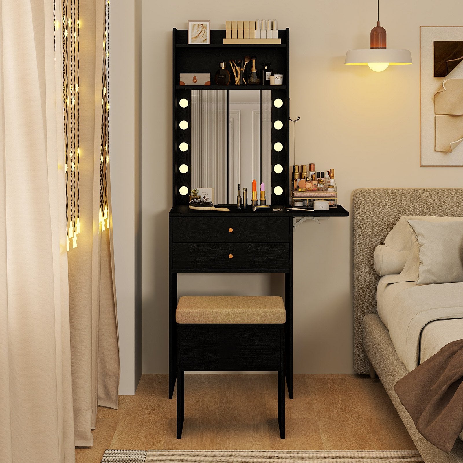 ● Spacious Storage Solution: Equipped with 2 open shelves 2 side hooks a spacious tabletop a drop leaf countertop and 2 sliding drawers this makeup dressing table provides large storage space to organize all your beauty essentials with ease.