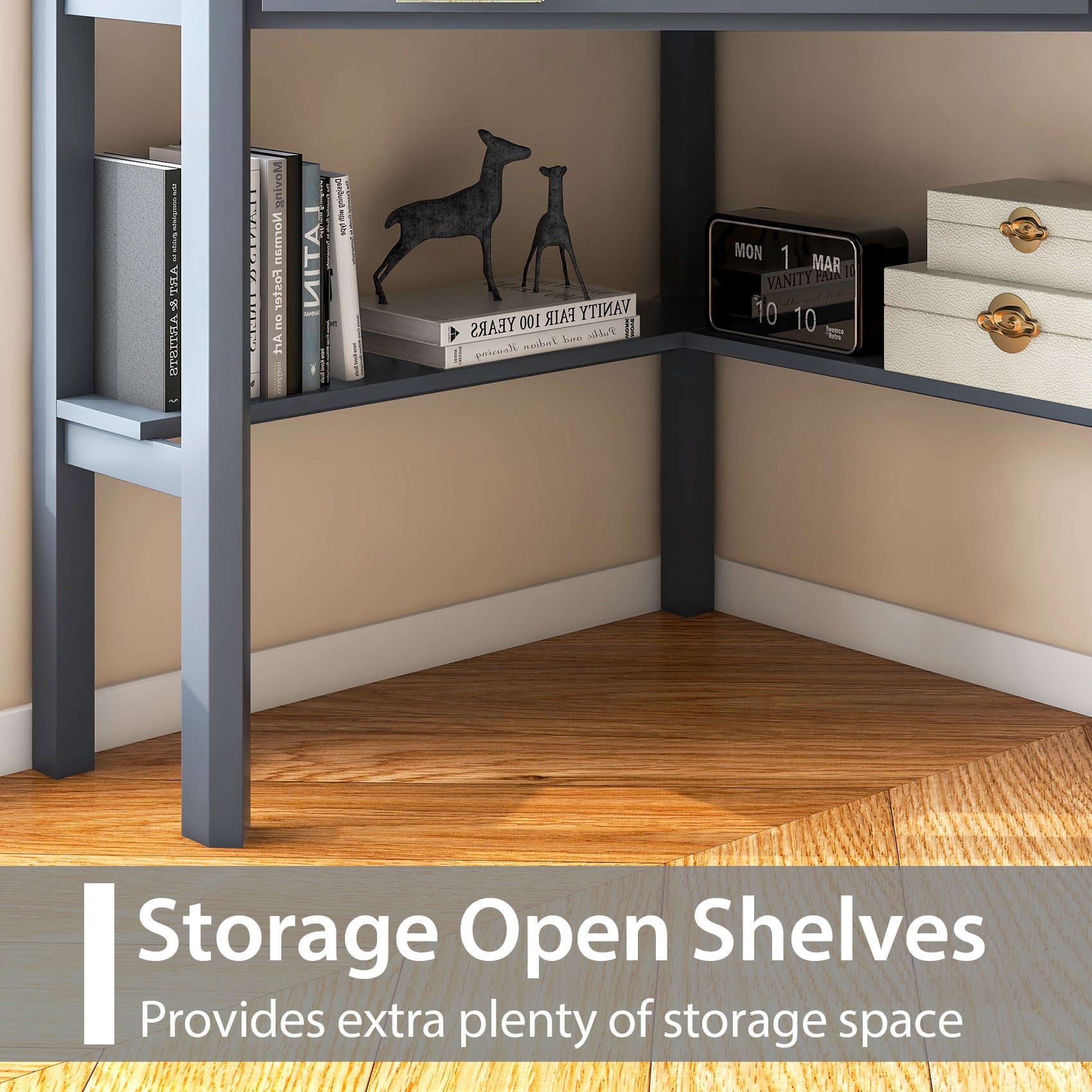 - ● A drawer and two shelves offer ample storage space