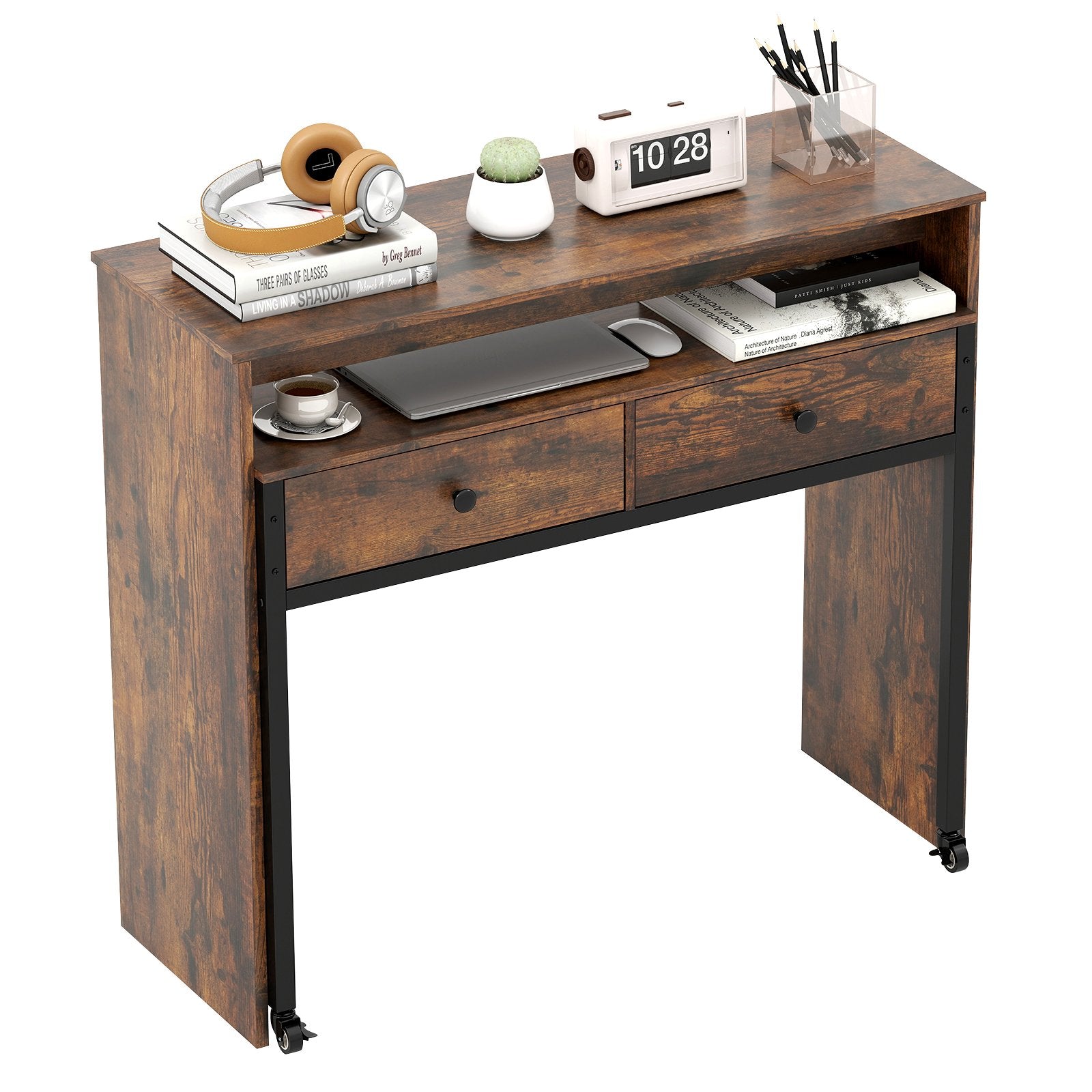 Extendable Computer Desk with 2 Storage Drawers Convertible Home Office Rolling Study Writing Desk-Black