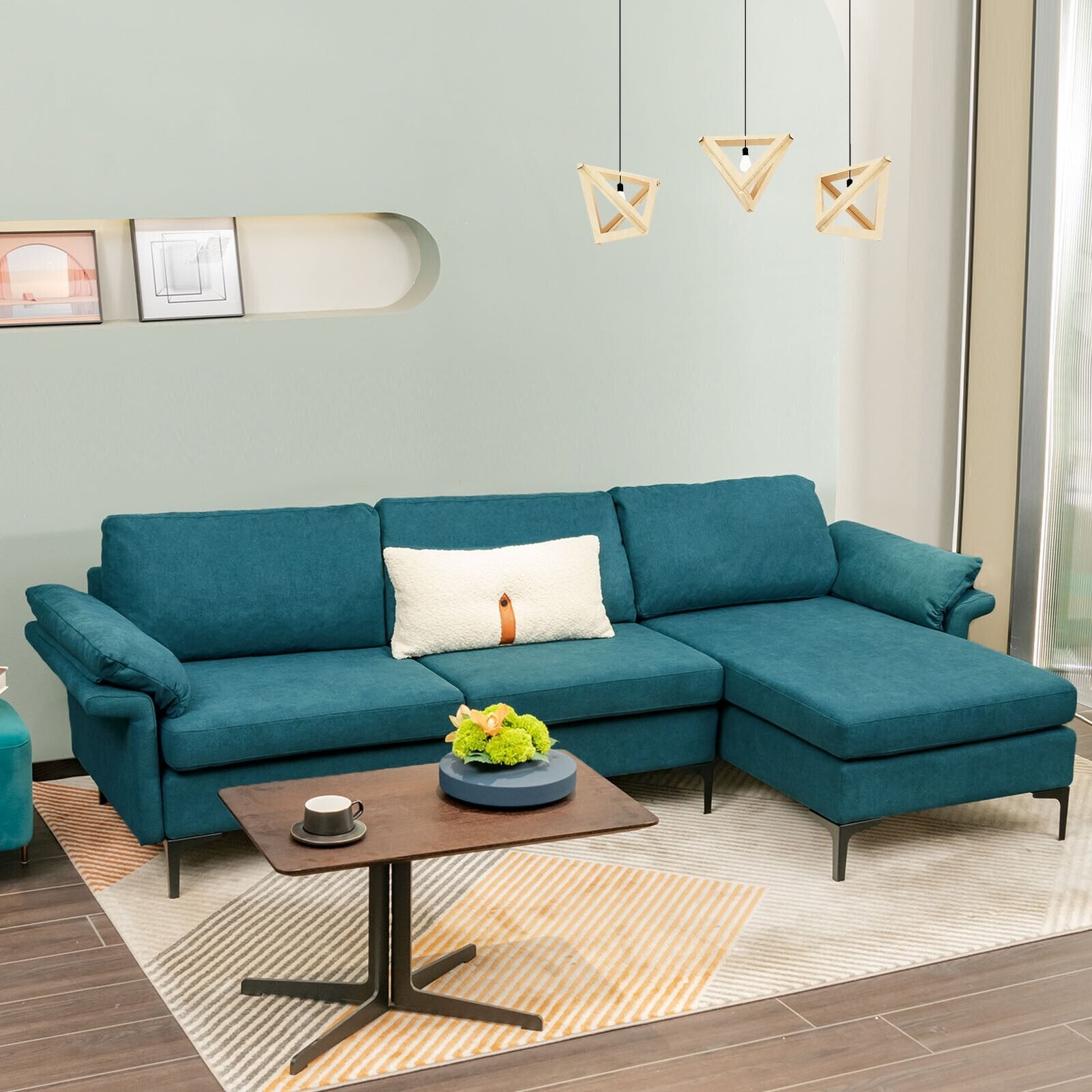 ● Comfortable Support: This sectional sofa uses skin-friendly linen fabric (Gray/Peacock Blue)/ lint fabric (Rust Red/Army Green) which is not easy to fade or winkle giving you a soft touch. It is generously padded with a high-density sponge with an original distributed spring system to ensure lasting plumpness and elasticity. Besides this sofa comes with a comfortable backrest and armrest cushions.