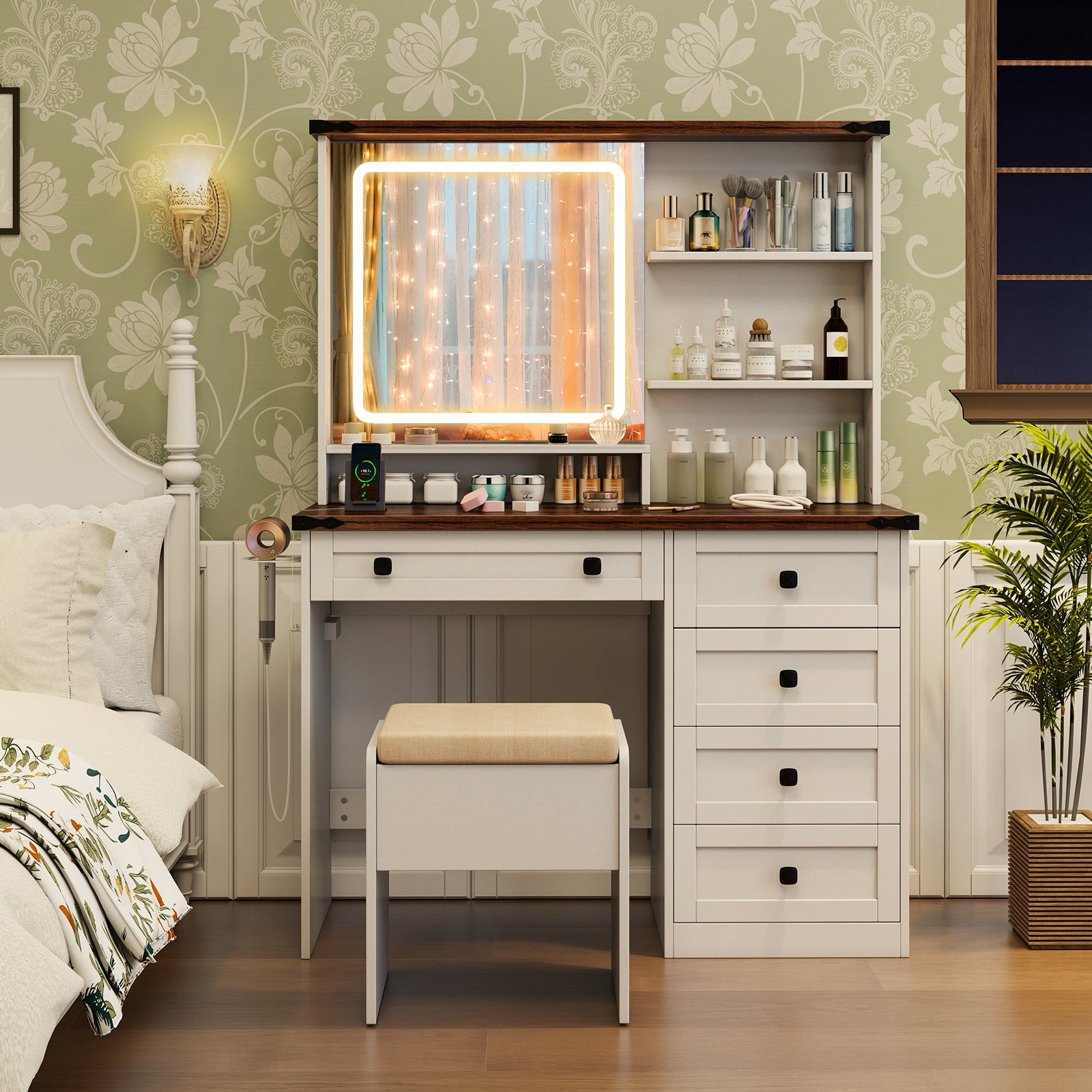 ● 3-color Lighted Vanity Mirror: The vanity table features a lighted mirror with touch control. There are 3 color settings (warm yellow/warm white/cool white) and adjustable brightness. You can press the touch switch to adjust the color and brightness.