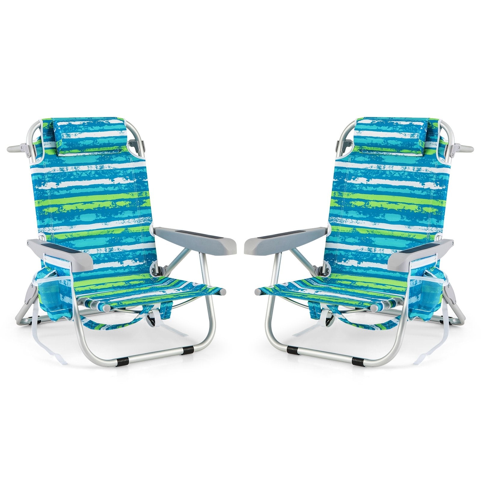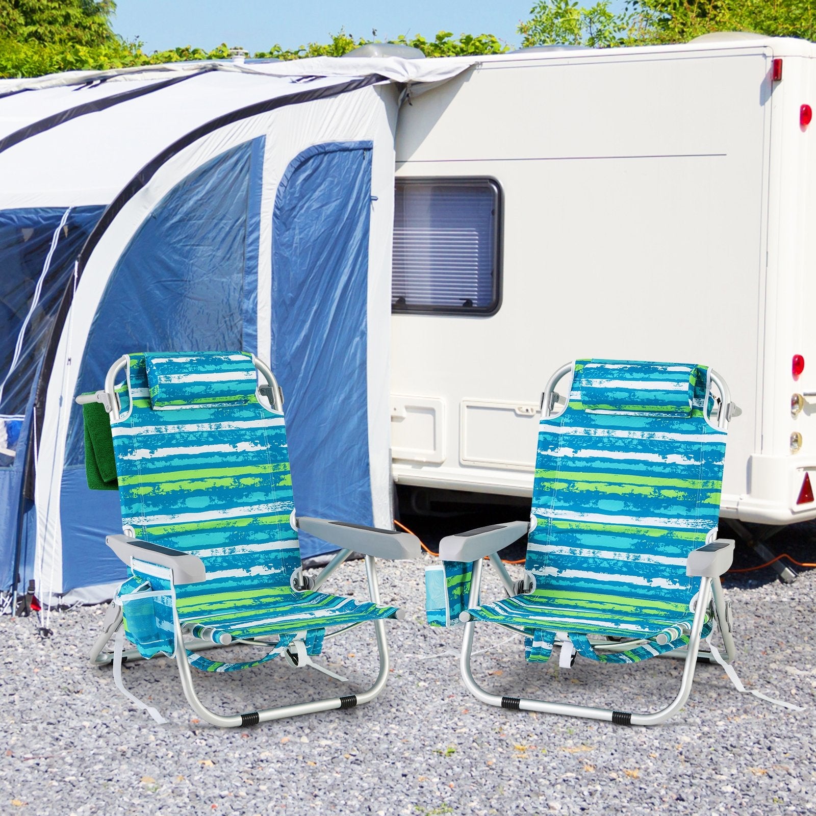 Foldable Backpack Beach Chair with Cup Holder and Storage Pockets Set of 2-Blue