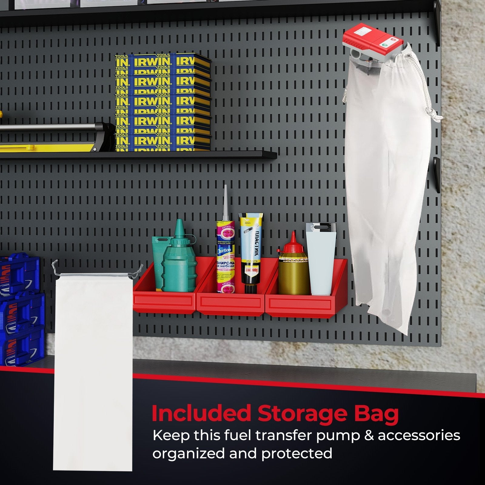 ● Convenient Storage: The smart design includes manual nozzle storage behind the battery box ensuring no loose parts. A handy storage bag is also included perfect for keeping the fuel transfer pump and its accessories neatly organized and well-protected during storage or transport.