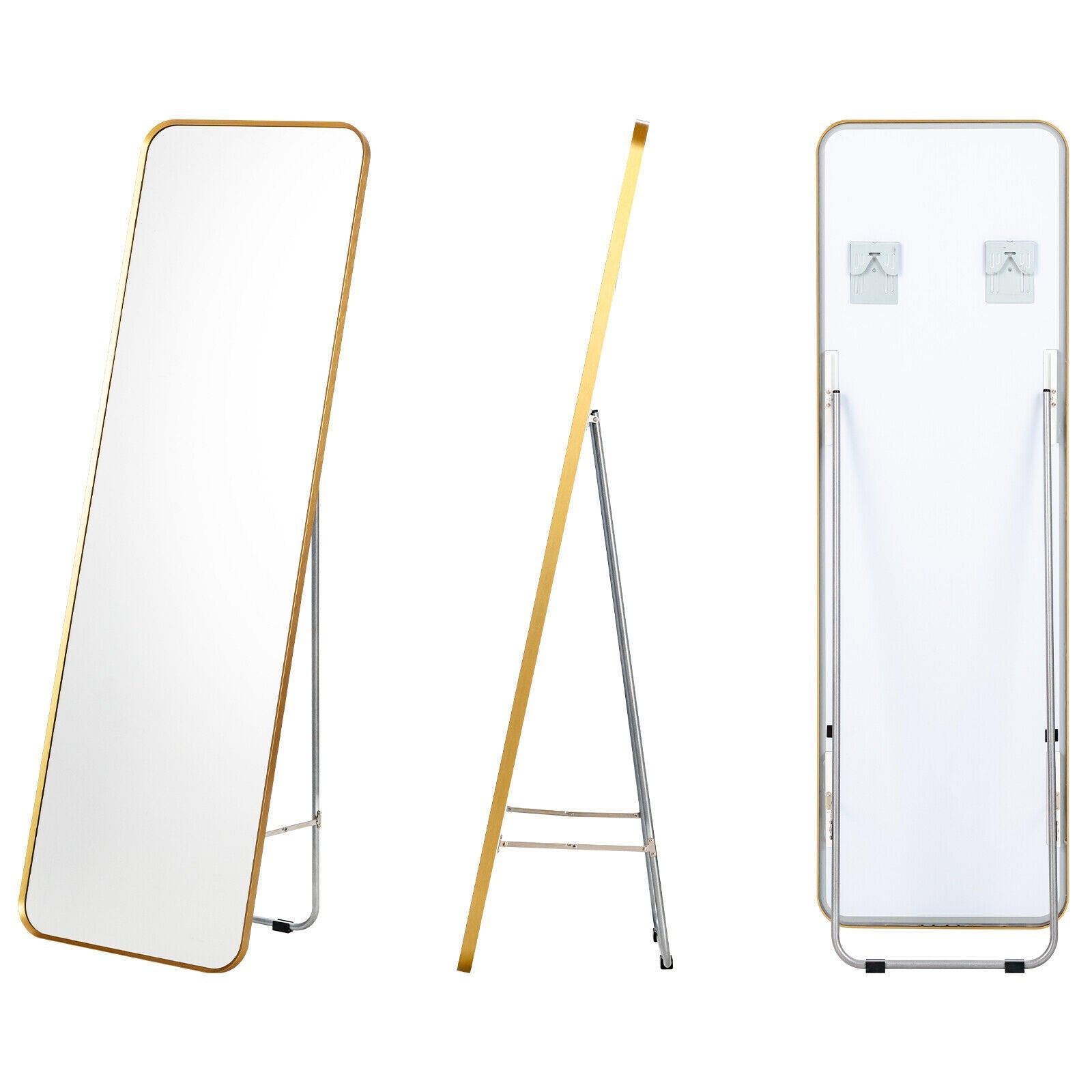 The full-length mirror with a gold steel frame will be a great addition to your room. This full-length mirror is designed to be used in 2 different ways according to your needs including hanging on the wall and standing on the floor. Users can adjust the retractable stand to the desired height. And the installation of the wall is easy with instructions and accessories. Also the gold narrow bezel design not only offers a larger view from head to toe but also makes this full length a beautiful decoration in your room. In addition the mirror is equipped with explosion-proof film to prevent broken glass from splashing when accidentally breaking. Our full-length mirror is suitable for many places such as bedrooms living rooms hallways and more.
