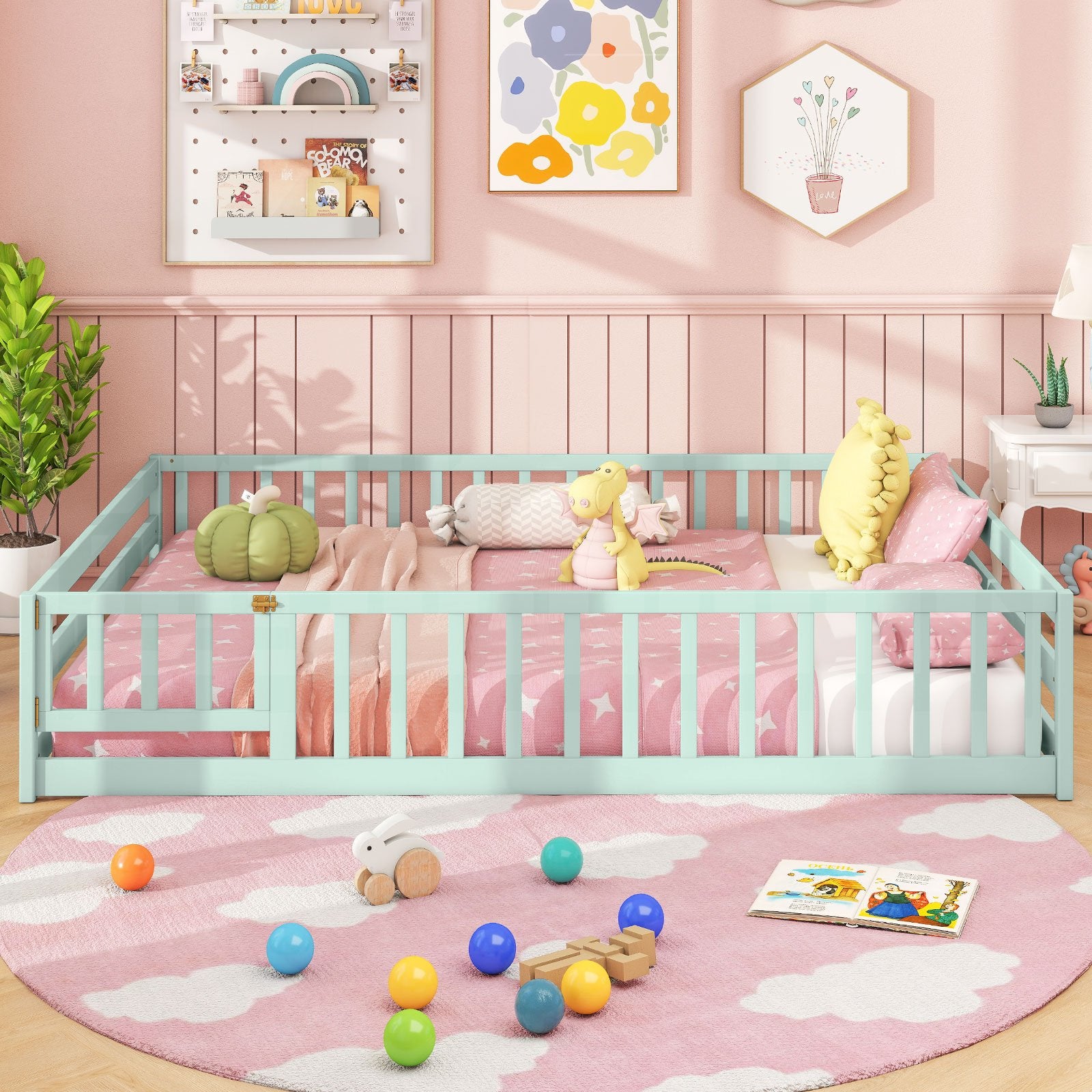 Full Size Floor Bed with Full Length Safety Guardrails-Dark Green