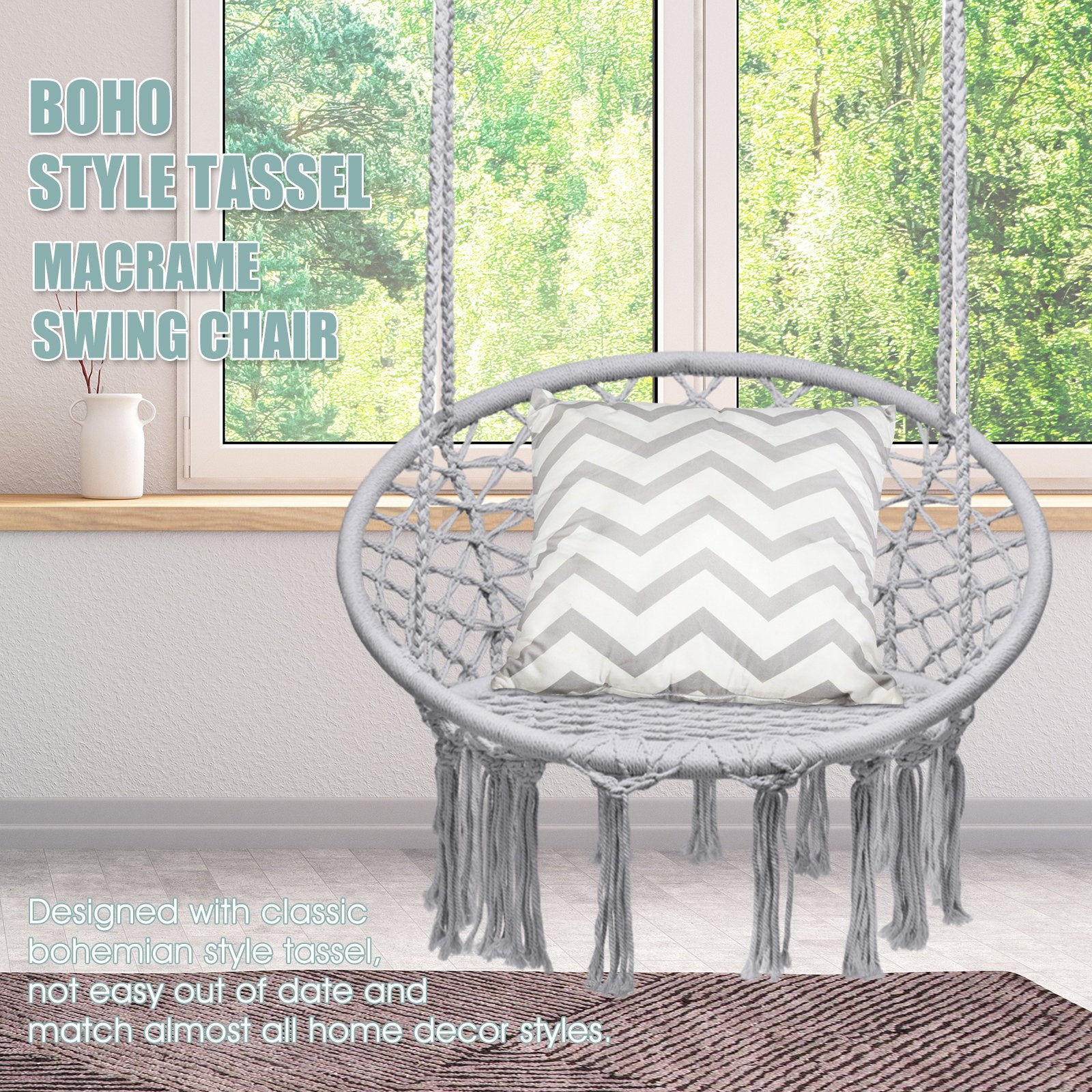 ● Chic and Nordic Style: Stylishly crafted from macrame net chair pattern with fringe tassels this hammock chair is blended in the Nordic or bohemian feel to show the retro and stylish style and serve as a unique charming decoration piece.