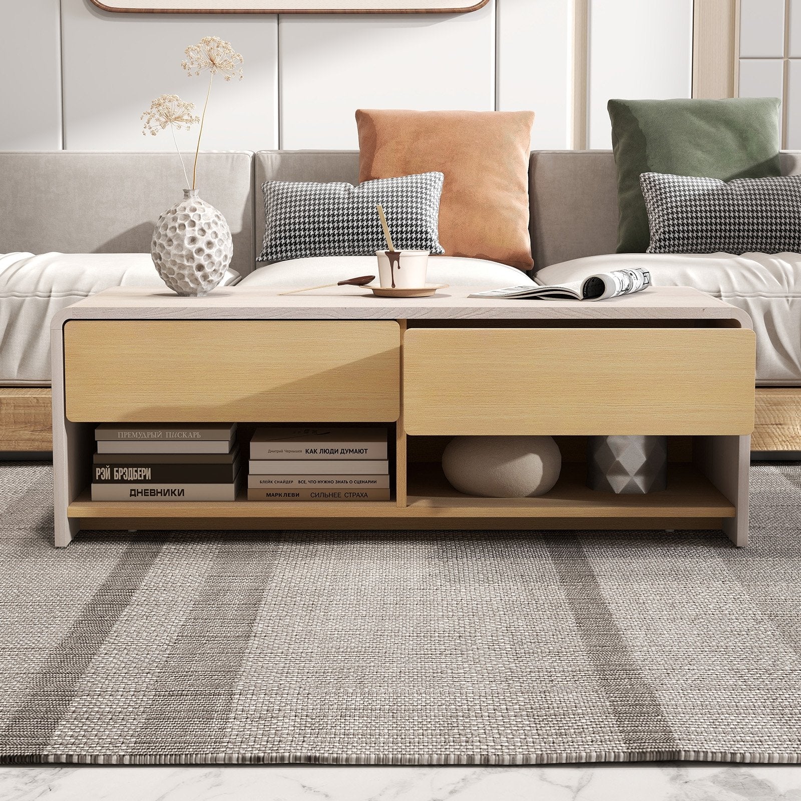 Home Coffee Table with 2 Drawers and 2 Storage Shelf-White & Natural