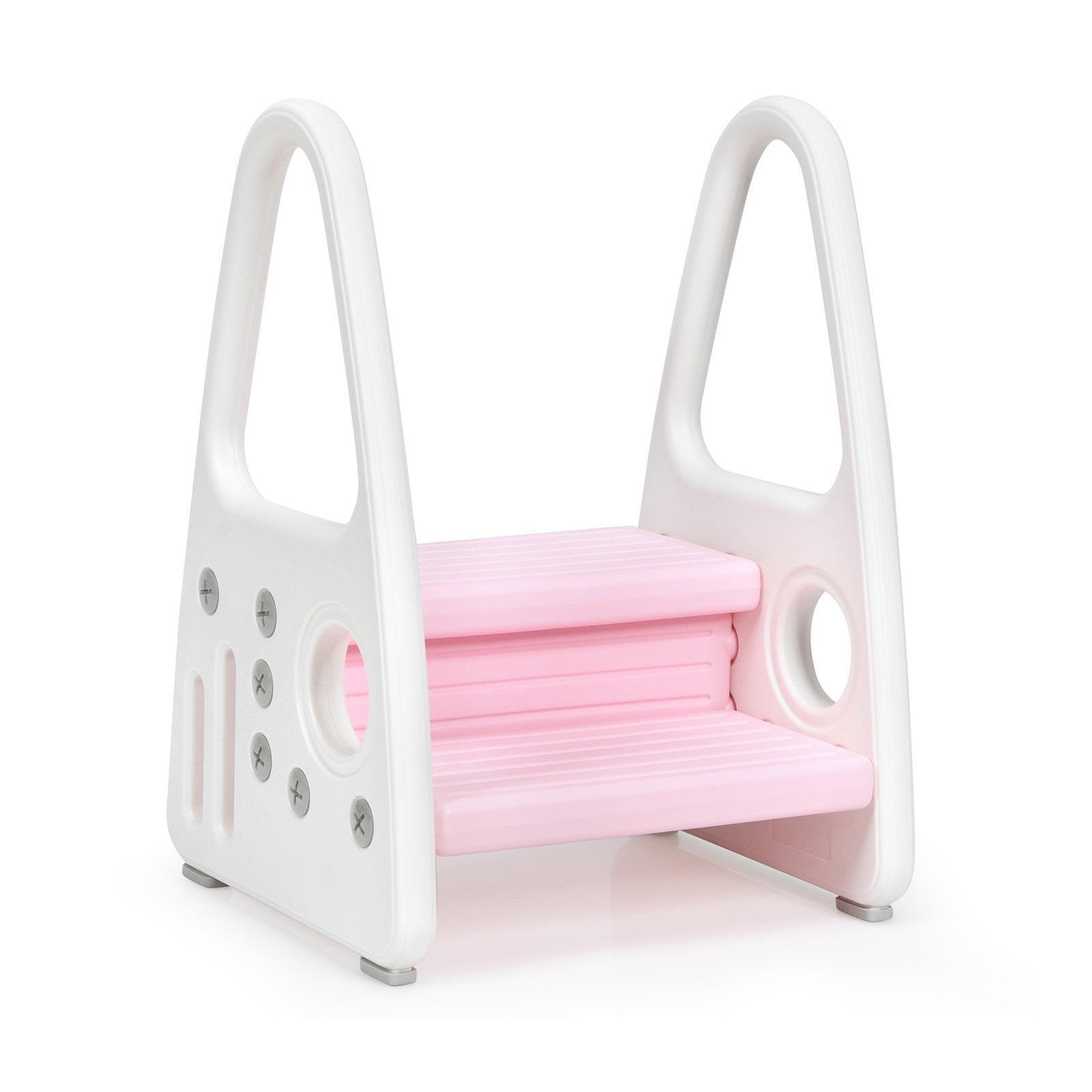 This kids kitchen step stool can be turned into a chair which is very versatile. It can help children go to the toilet brush their teeth and wash their hands independently. Besides the double-tier design is suitable for children of different ages and can be used by children for a long time. The kid's step stool features comfortable armrests and the anti-slip design of the pedal which allow your child to gain confidence when climbing. The grid design at the bottom and triangular structure make the footstool not only stable but also capable of bearing 110 lbs. The non-toxic HDPE and rounded corner design ensure that your kid can use it in a safe environment. What's more the non-slip foot pads can protect the floor when moving. The simple assembly process saves you time and energy.