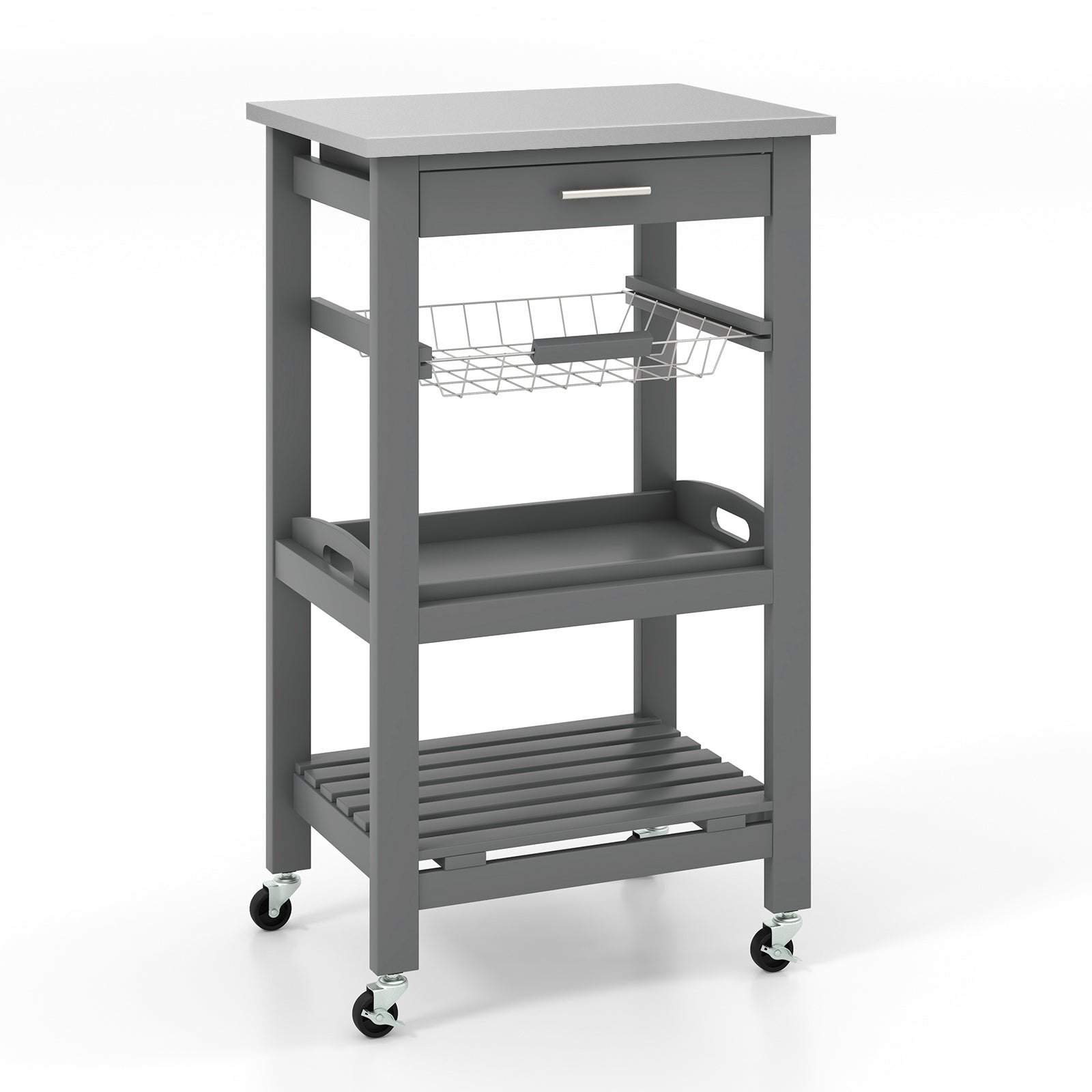 ● Features a stainless steel top a spacious pull out storage drawer a slide out wire basket a removable tray and a detachable shelf