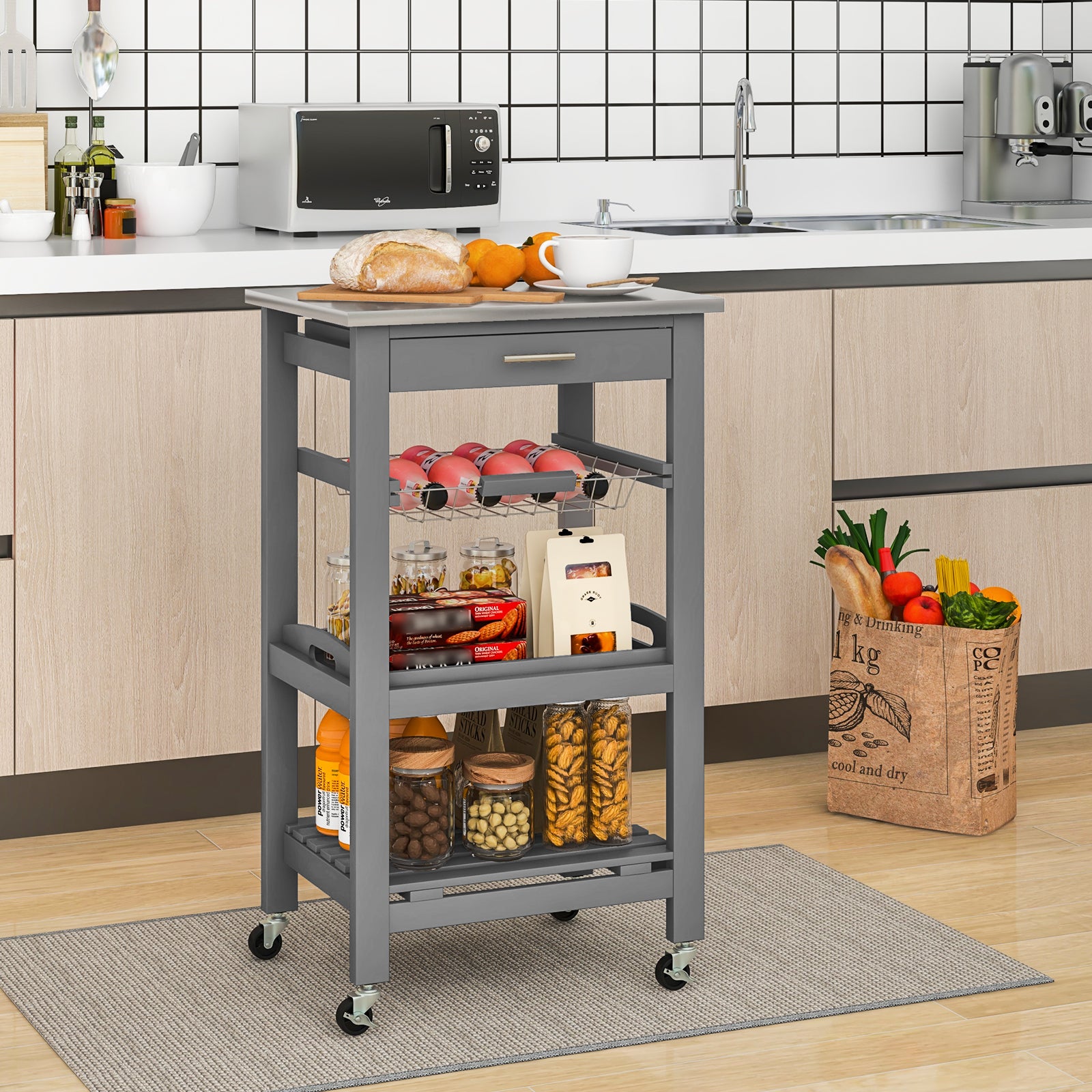 ● Sufficient Storage Space: It is great to place the oven or microwave on the stainless steel top of this kitchen cart. And with a drawer basket tray and shelf this trolley can add extra space for containing more things which allows your kitchen countertop organized and clean. The design of the shelf can protect things and bottles from falling.