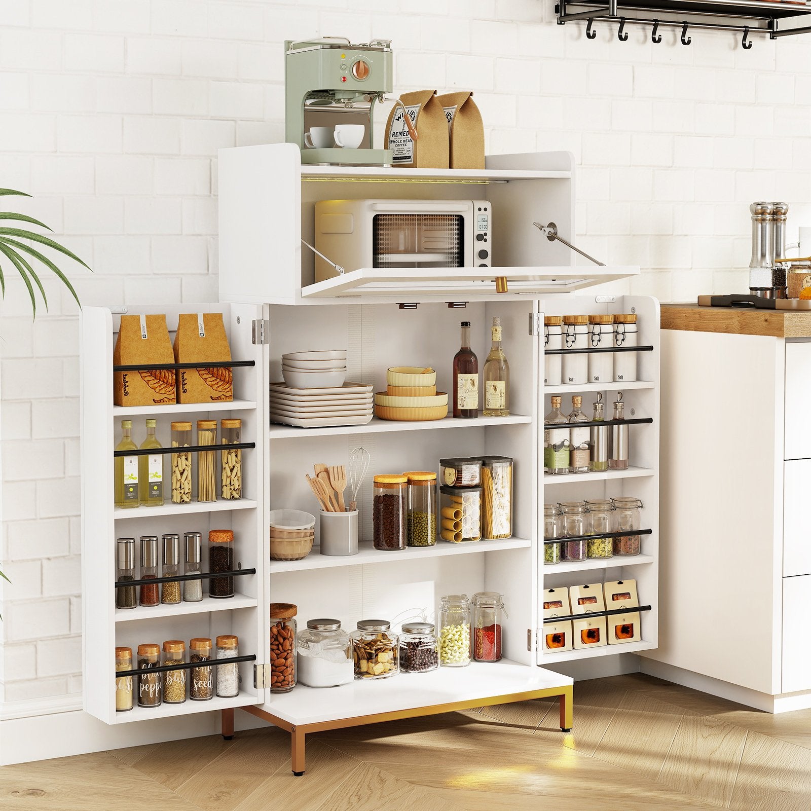 ● Elevate Your Kitchen Aesthetics: Sleek finish chic golden knobs and safe round corners—this mini pantry is designed to impress. Magnetic door catches and premium metal hinges make opening and closing a breeze adding a touch of luxury to your daily routine.