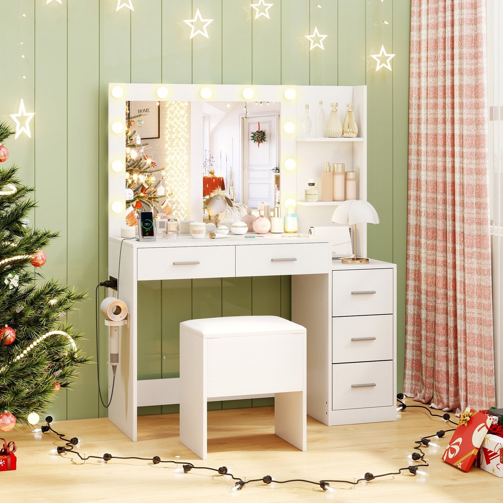● Appliance-Ready Design: The vanity table features a built-in charging station with 2 AC outlets and 2 USB ports ensuring your devices stay fully charged. The included hair dryer stand can be installed on either side of the desk keeps your styling tools within arm's reach.