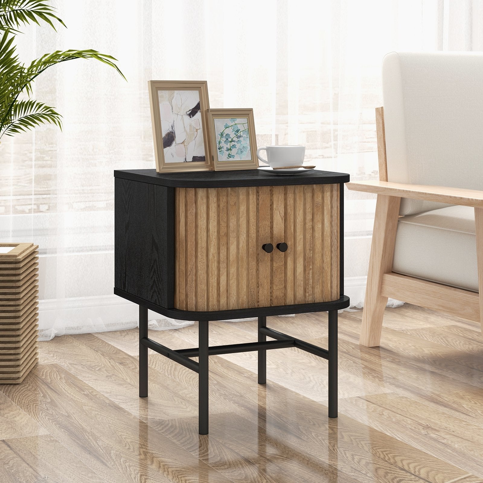 Mid-century Modern Nightstand with Sliding Doors and Storage Cabinet-Black