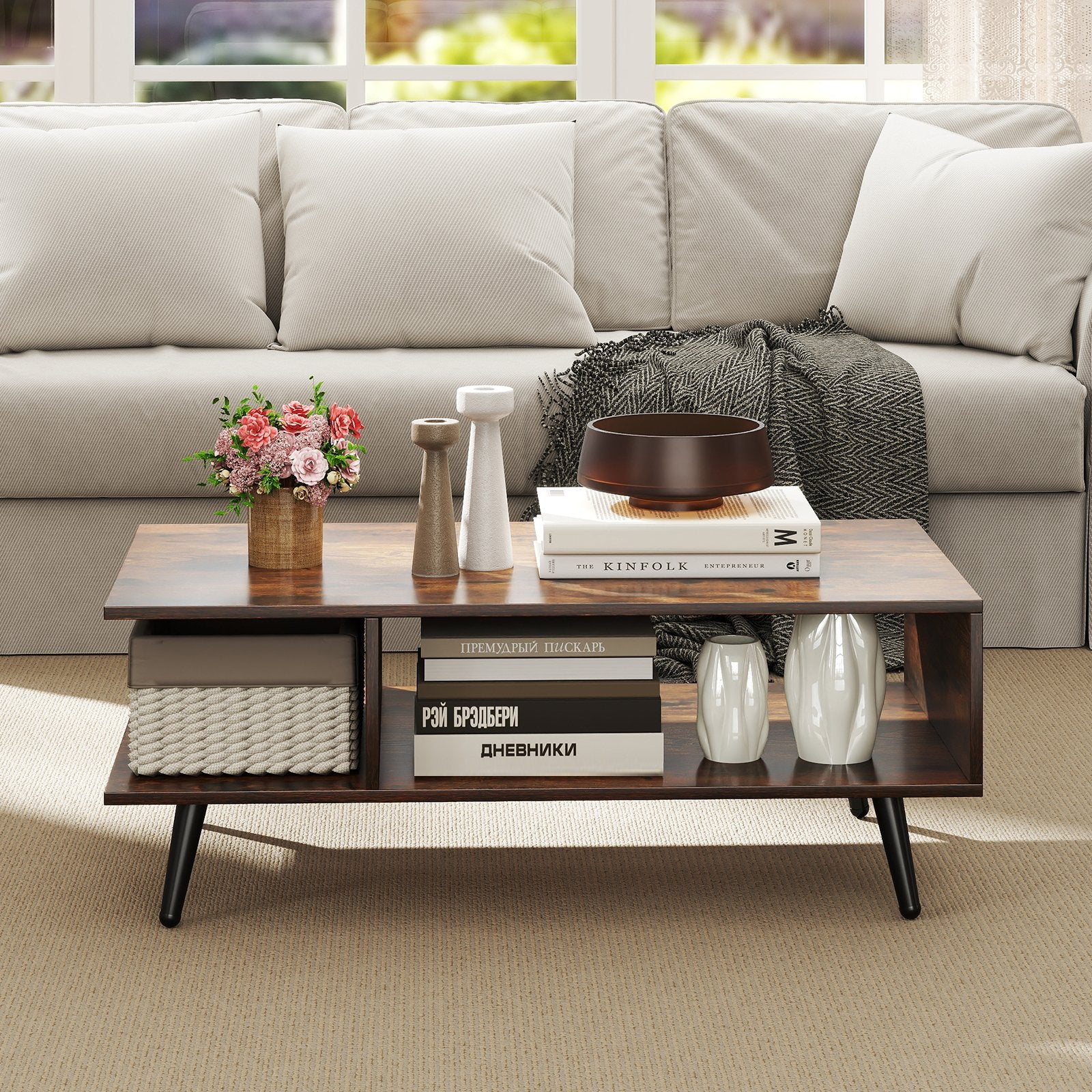 Mid Century Modern Rectangle Coffee Table 2-Tier Accent Table with 2 Open Compartments-Rustic Brown