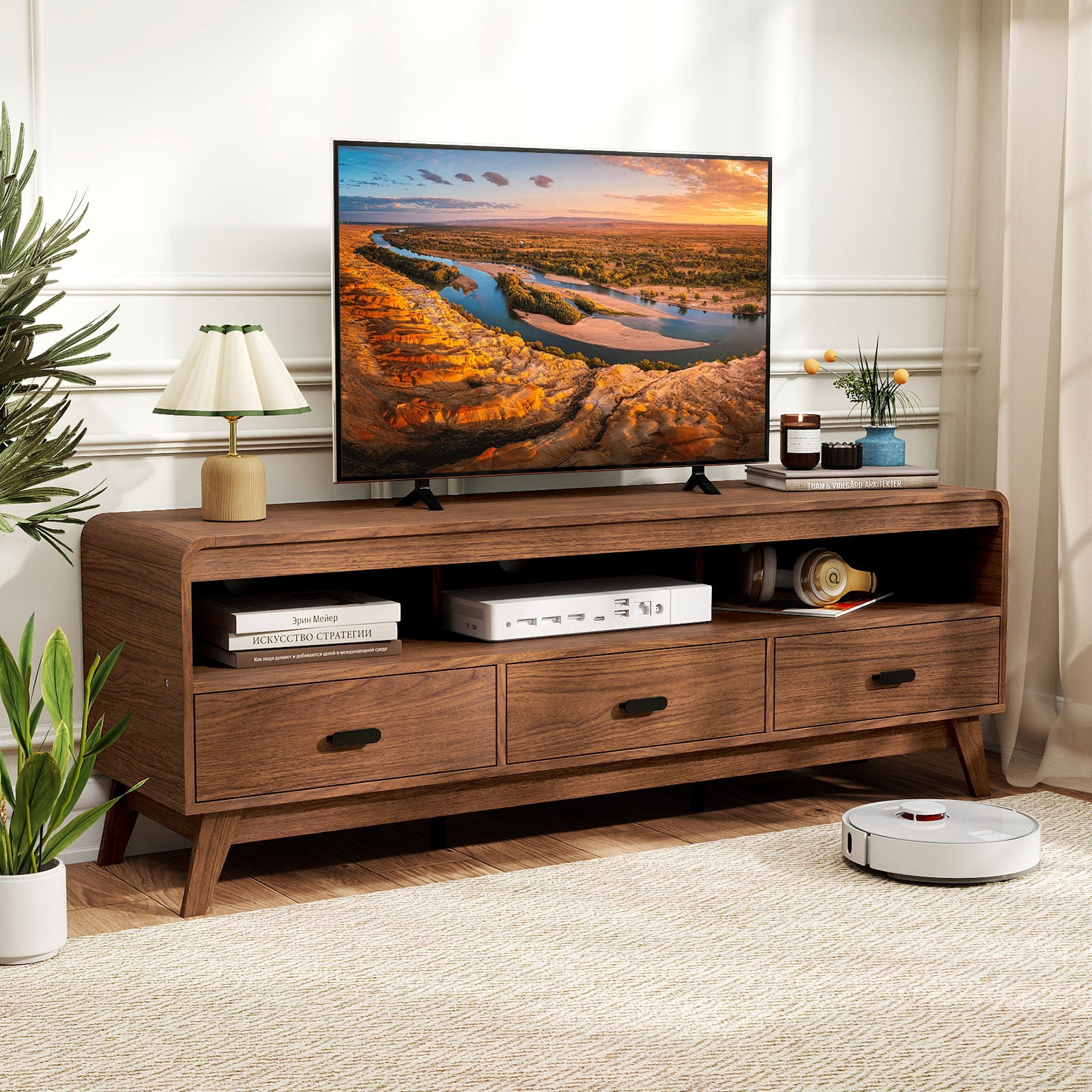 Mid Century Modern TV Stand for TVs up to 70" with 3 Storage Drawers and Open Shelves-Walnut