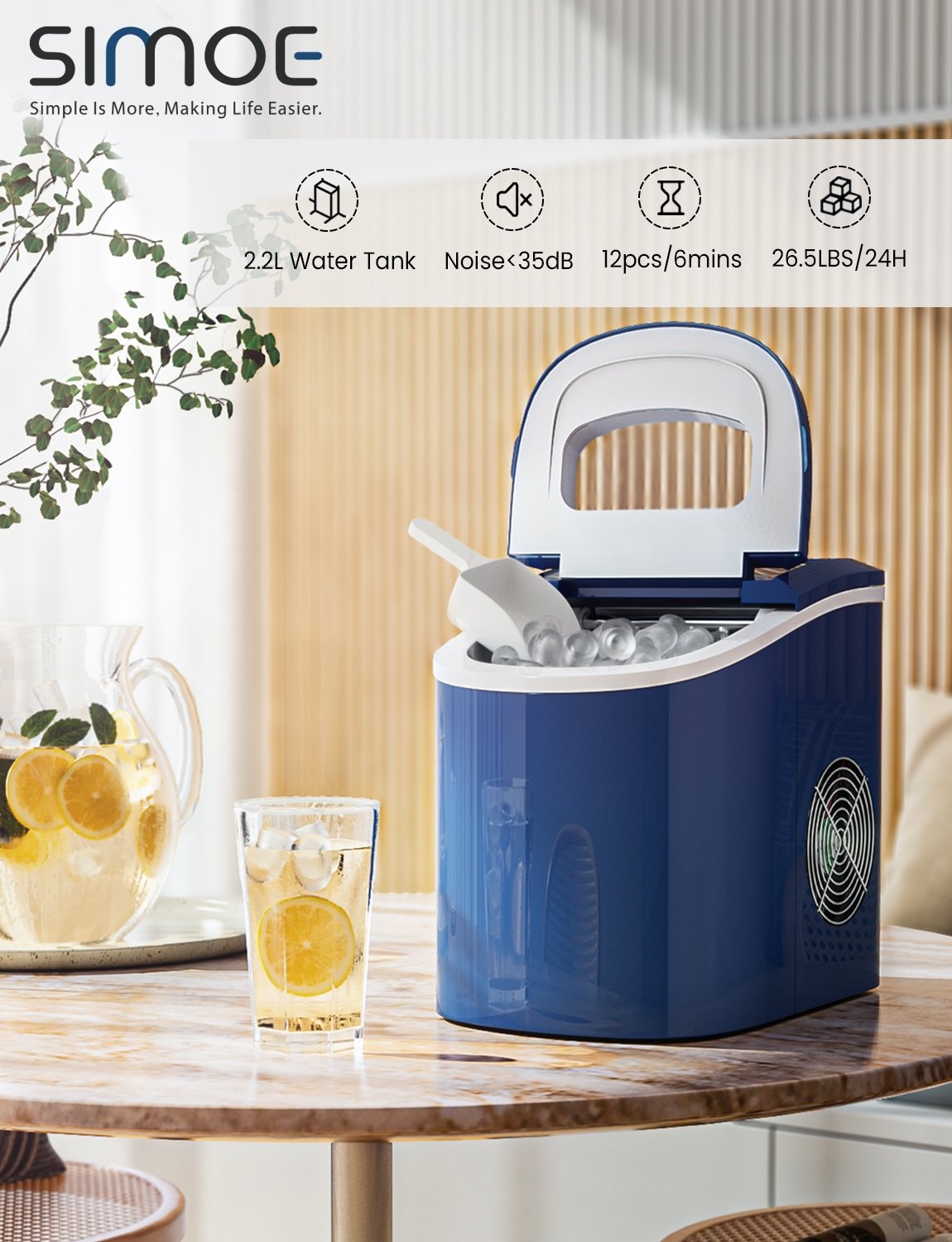 ● Quickly Ice Making and Large Making Capacity: This ice maker can make up to 9 bullet-shaped ice cubes in as little as 6 minutes and can make up to 26.5 lbs. of ice cubes per day with its 2.2-liter water reservoir. Just keep the water tank filled and it will be able to meet a full day's supply of ice.