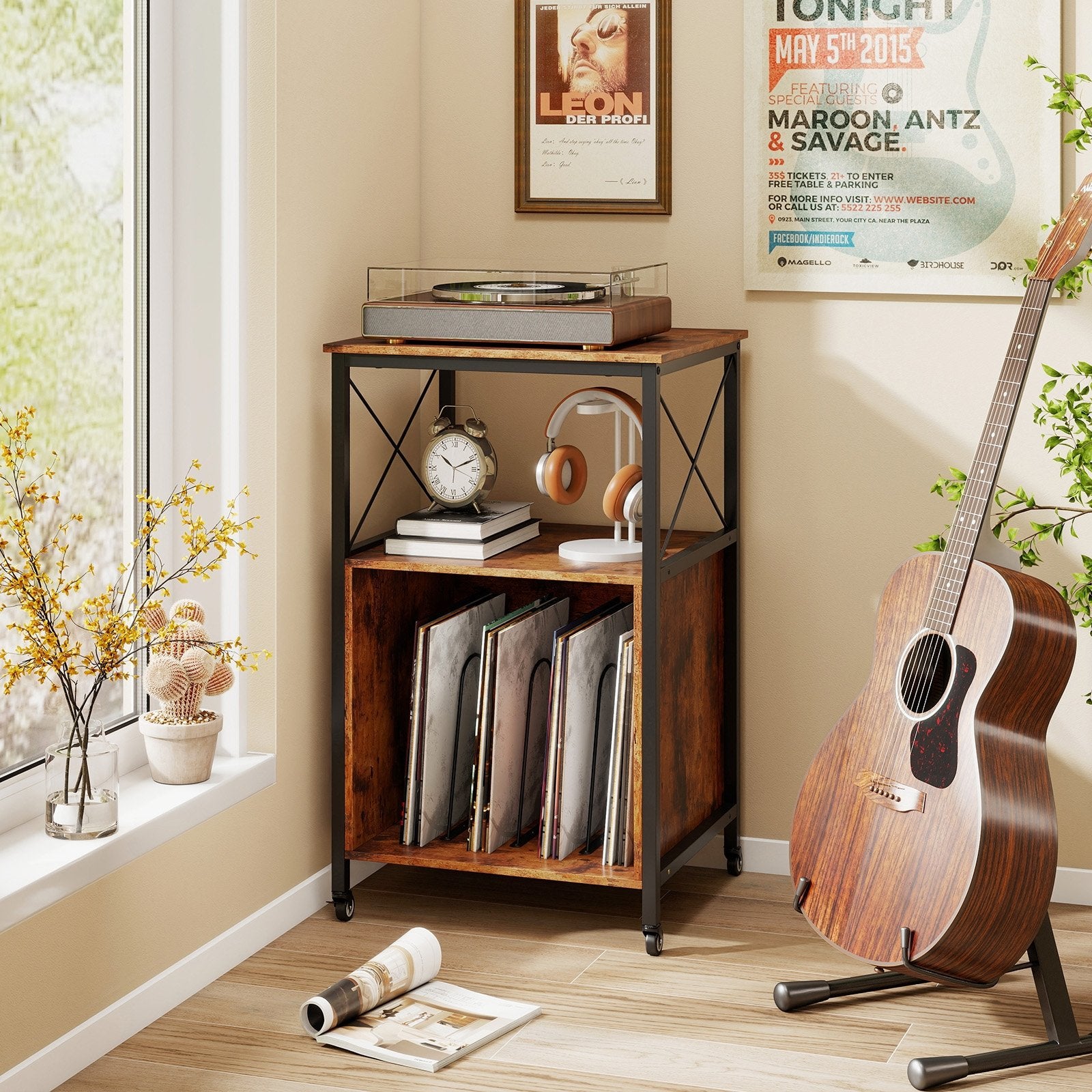 Mobile Record Player Stand with Power Outlet with Open Shelf and Dividers-Rustic Brown