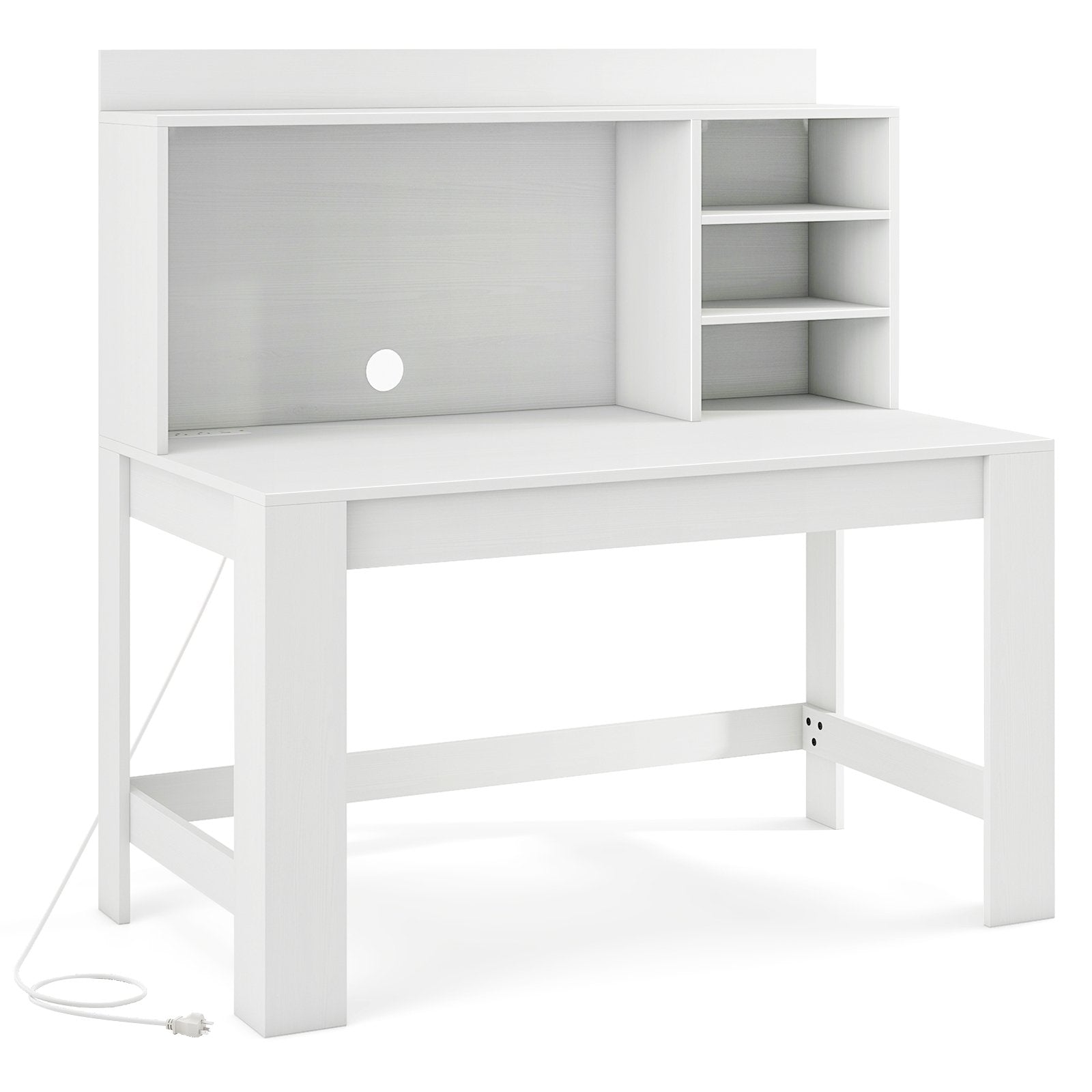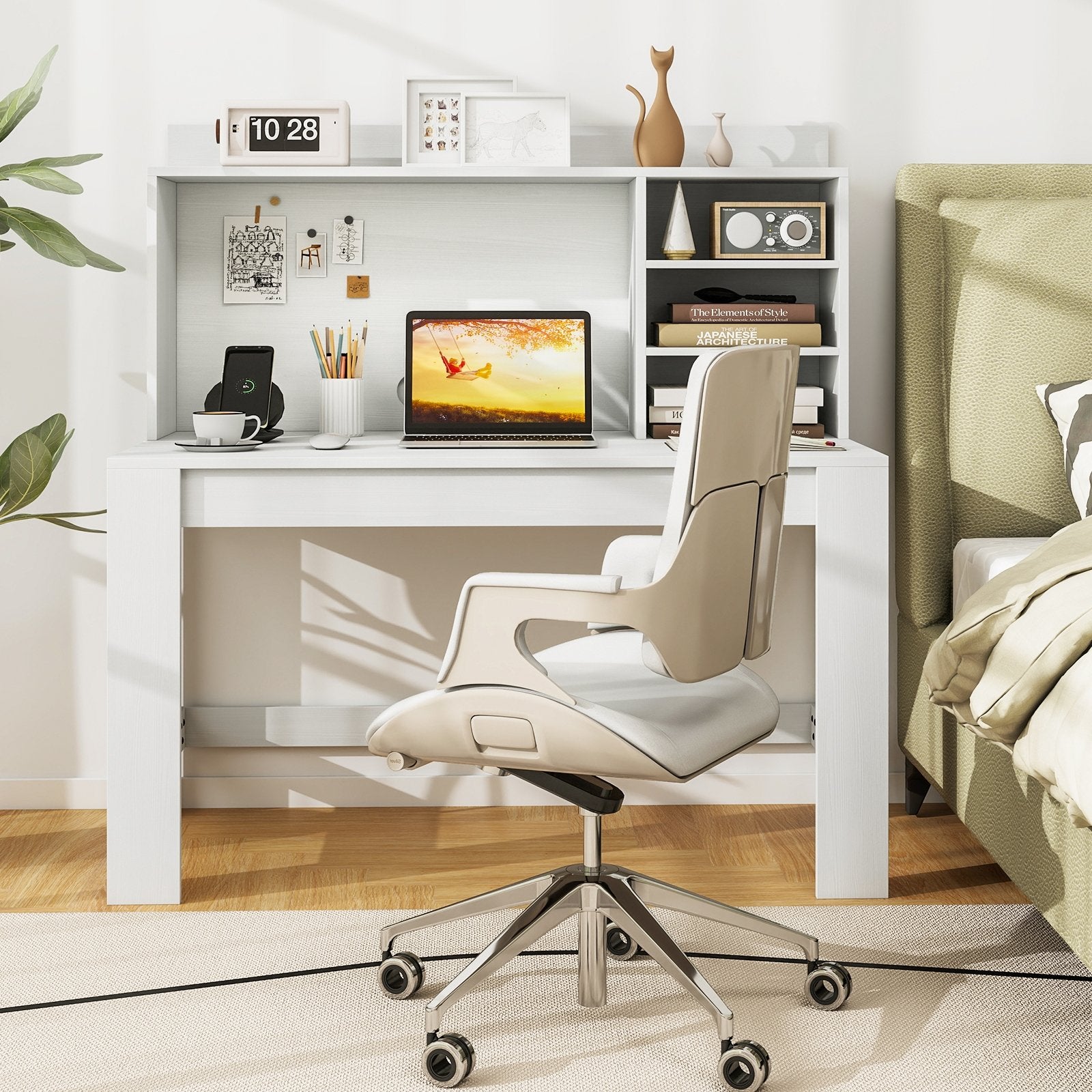 ● Large Storage Space: This white desk features a 23.5" wide desktop along with a raised display shelf and 3 storage shelves which offers ample room for your books office supplies plants documents and decorations. Besides the 16" height of the desktop compartment is suitable for laptop storage.