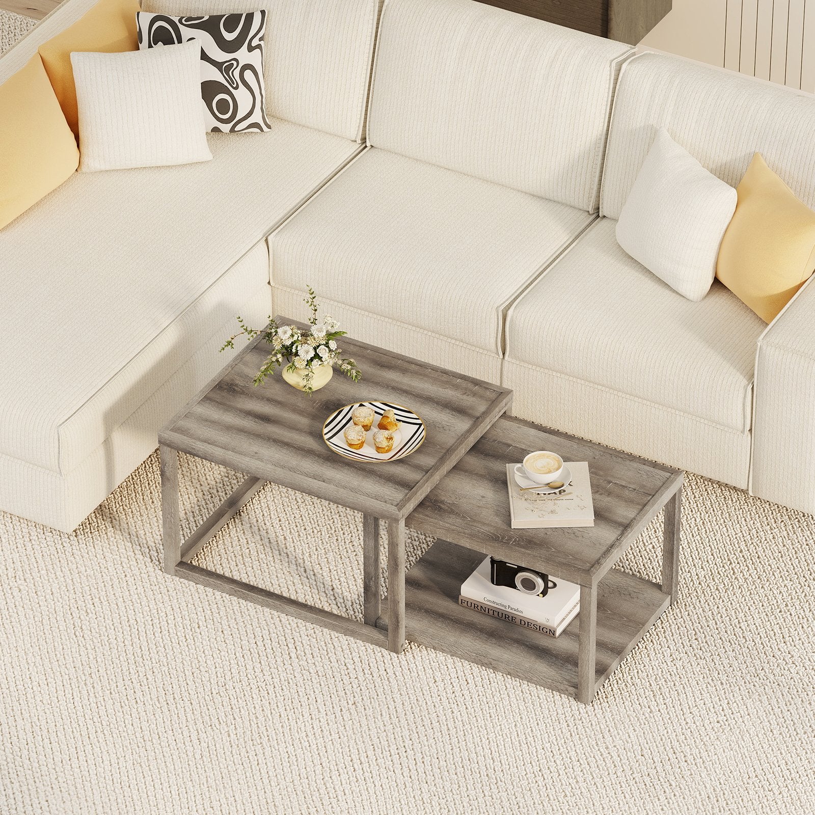 ● Get Organized in Style: These 2 pieces nesting coffee tables are designed to keep your living area neat and trendy. The rectangular top is perfect for cups plants and snacks with extra shelf space below for books or storage boxes.