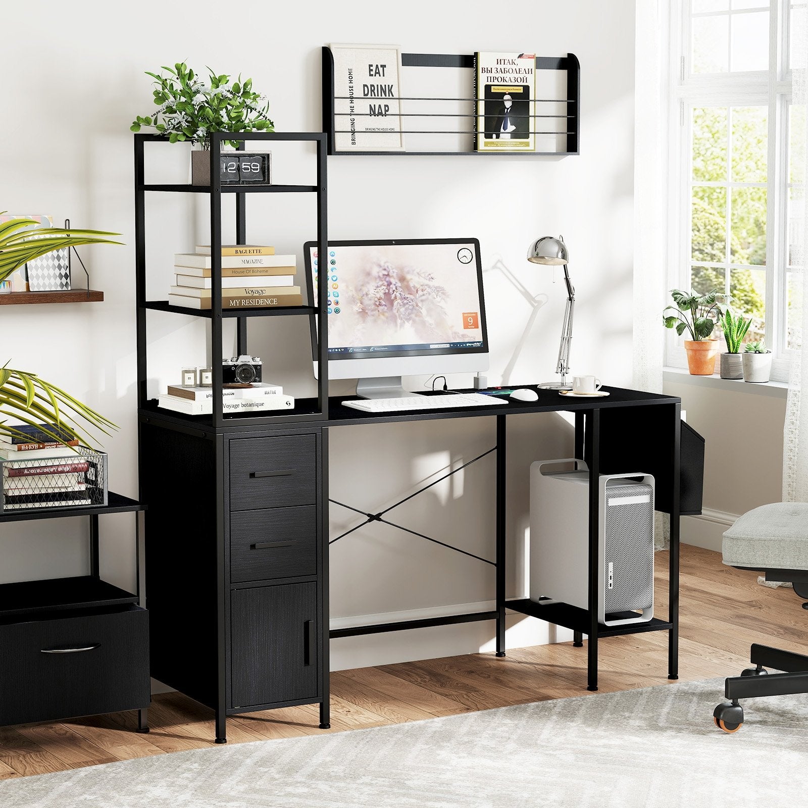● Ample Storage Solutions: The computer desk provides versatile storage with 2 open shelves 2 storage drawers a single-door cabinet a CPU stand and a storage pocket. This feature makes it easy to organize and store office essentials and personal items.