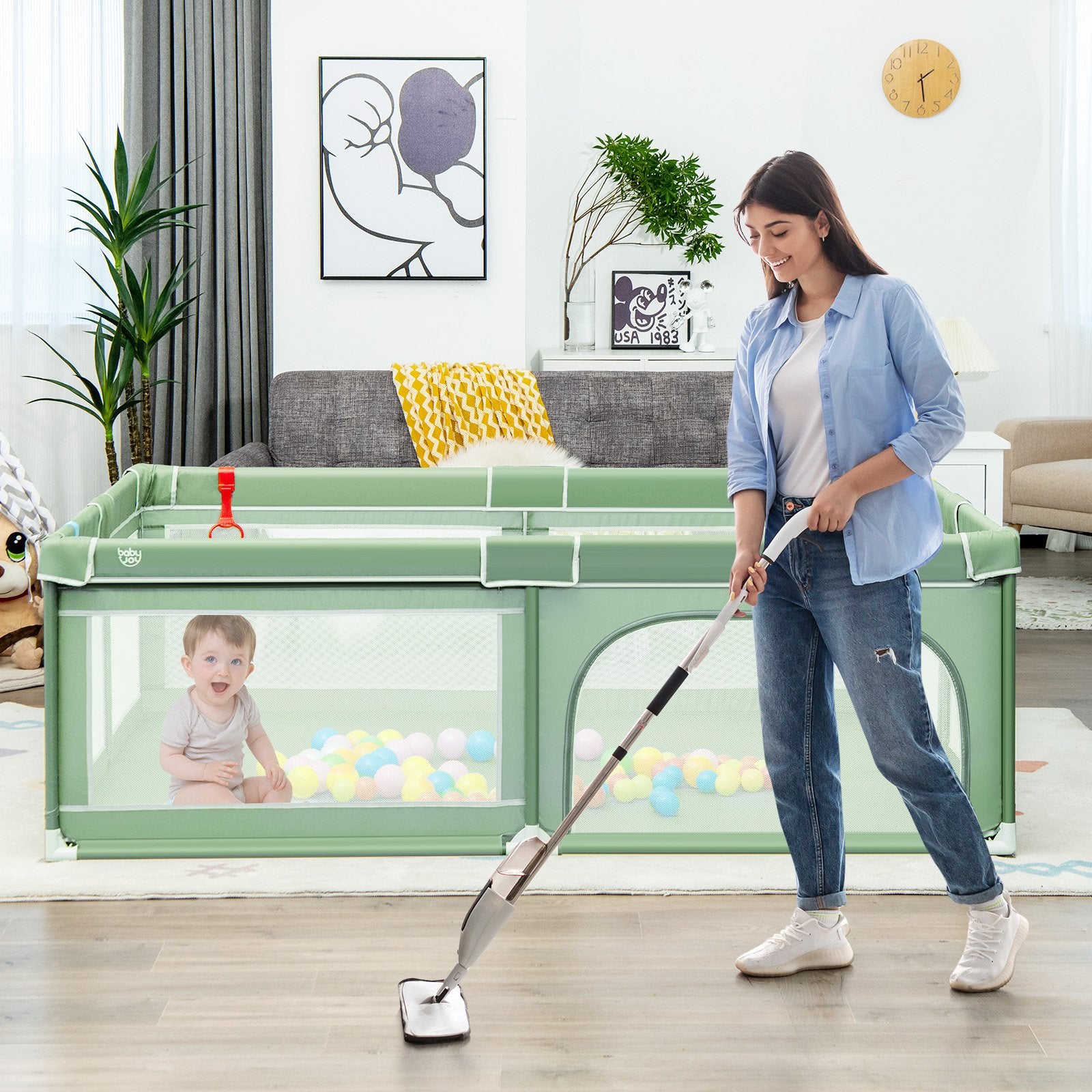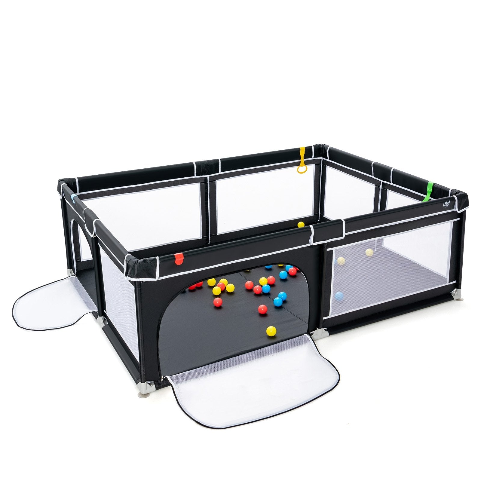 ● Visible Mesh and External Zipper: Breathable mesh wall enables parents to see their kids from all directions ensuring better interaction. Safety door with external zippers avoids kid's accident climbing out. In addition corner protection design prevents babies from directly touching the iron pipes.