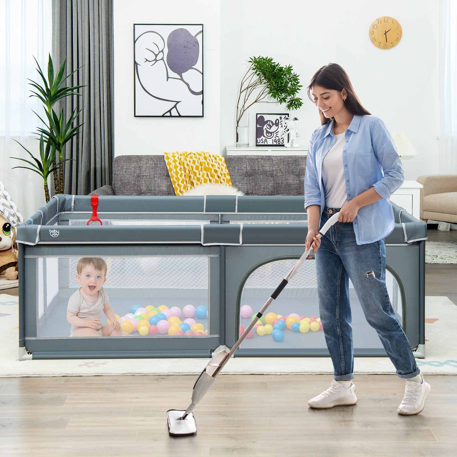 ● Safe and Comfortable Materials: The baby playpen with high-quality oxford fabric cover is odorless BPA-free and child-friendly which is harmless to baby's health and the environment. Besides soft sponge filling also ensures more comfort. And it's also ASTM certified to make this playpen more safe to use.