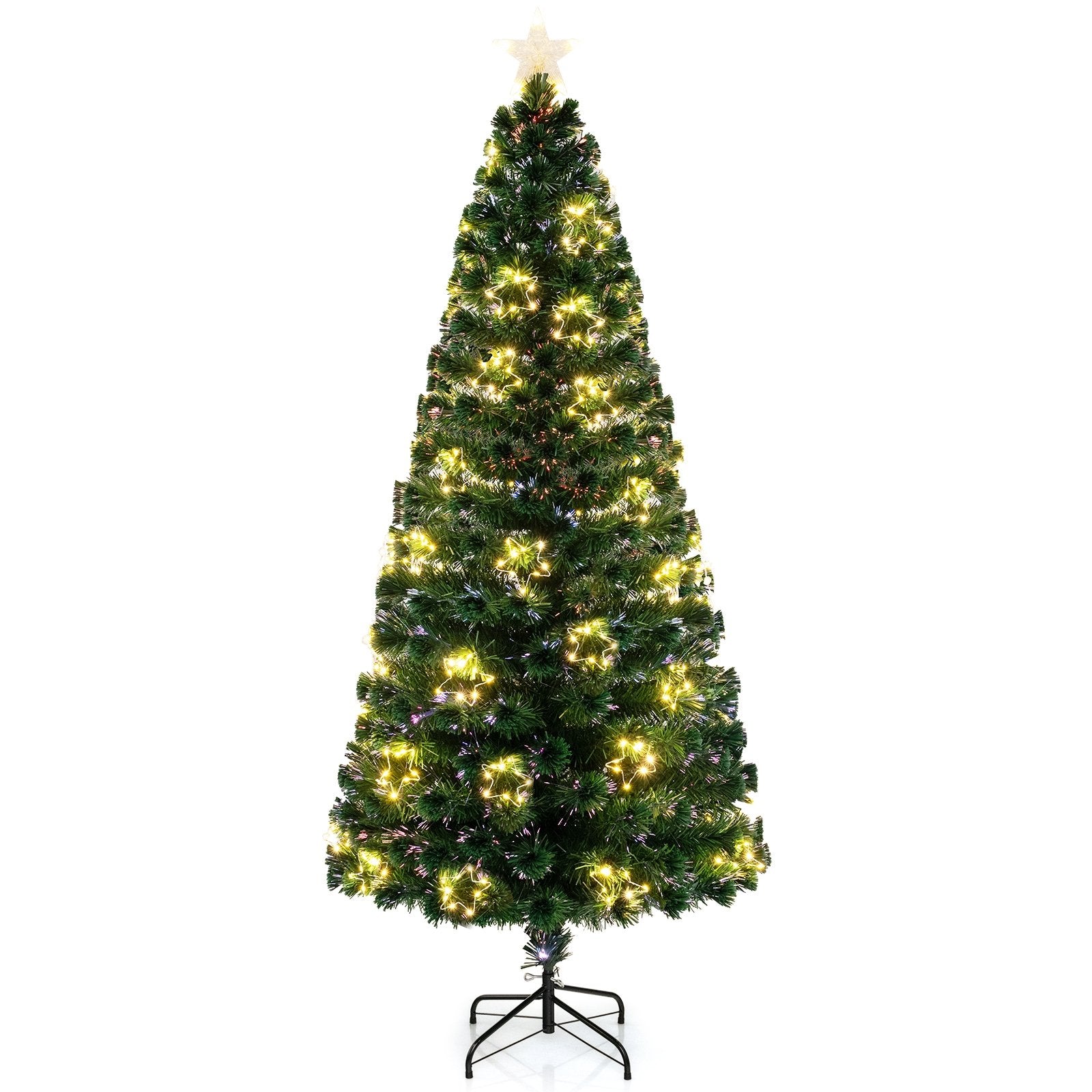 ● Pre-Lit Design: This 4/5/6/7 ft artificial Christmas tree comes with 18/24/36/48 shape-adjustable star string lights which can be arranged into various shapes like circles hearts and more. Additionally there is a shining top star light and sparkling colorful optical fibers adding a mesmerizing touch to your holiday decoration.