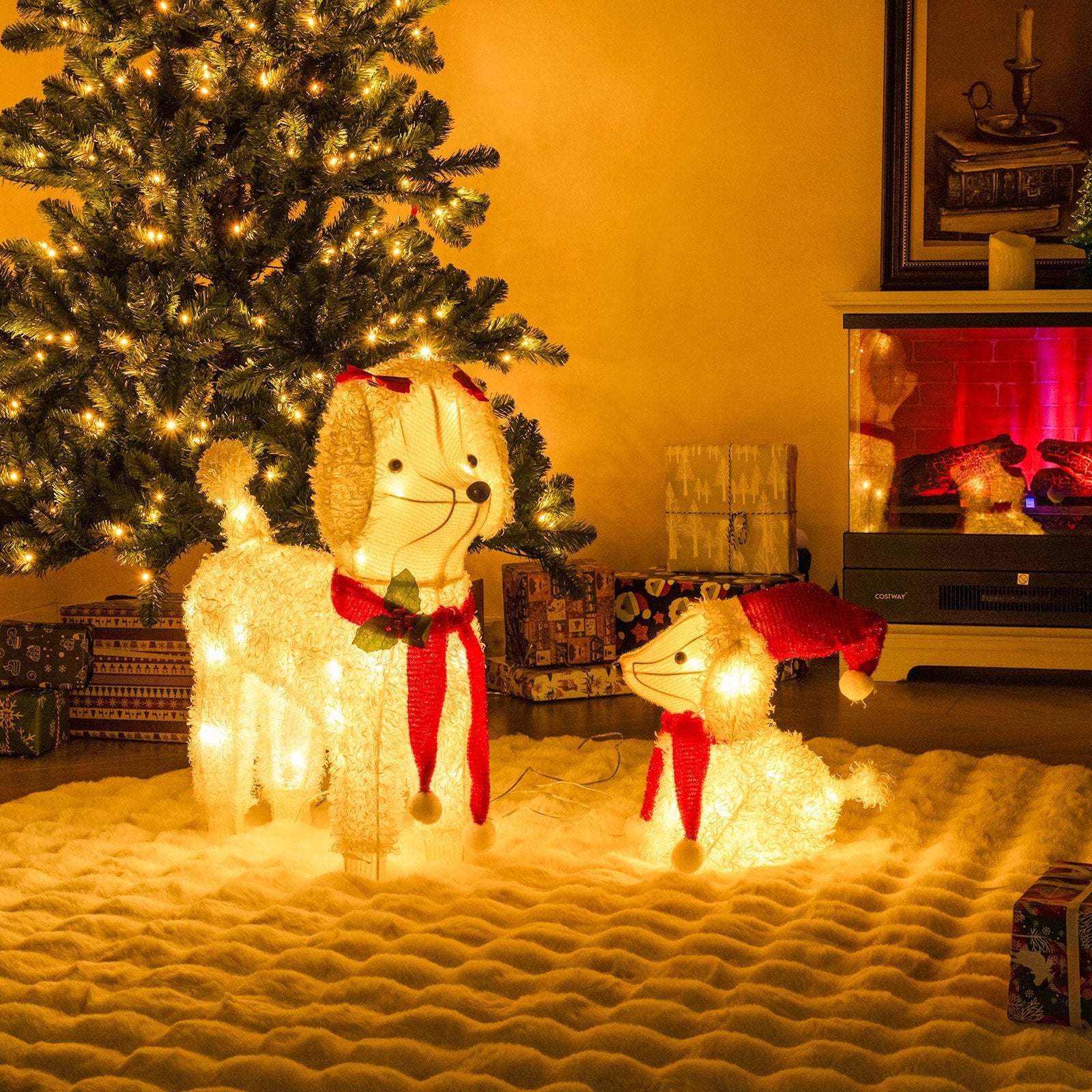 ● Adorable Mama and Baby Poodles: Cuddle up this holiday season with the charming mama & baby poodle dog decoration. With the padded Santa hat appealing scarves and fluffy surface the 2 lighted dogs will be the perfect addition to any festive gathering spreading holiday cheer to all who pass by.