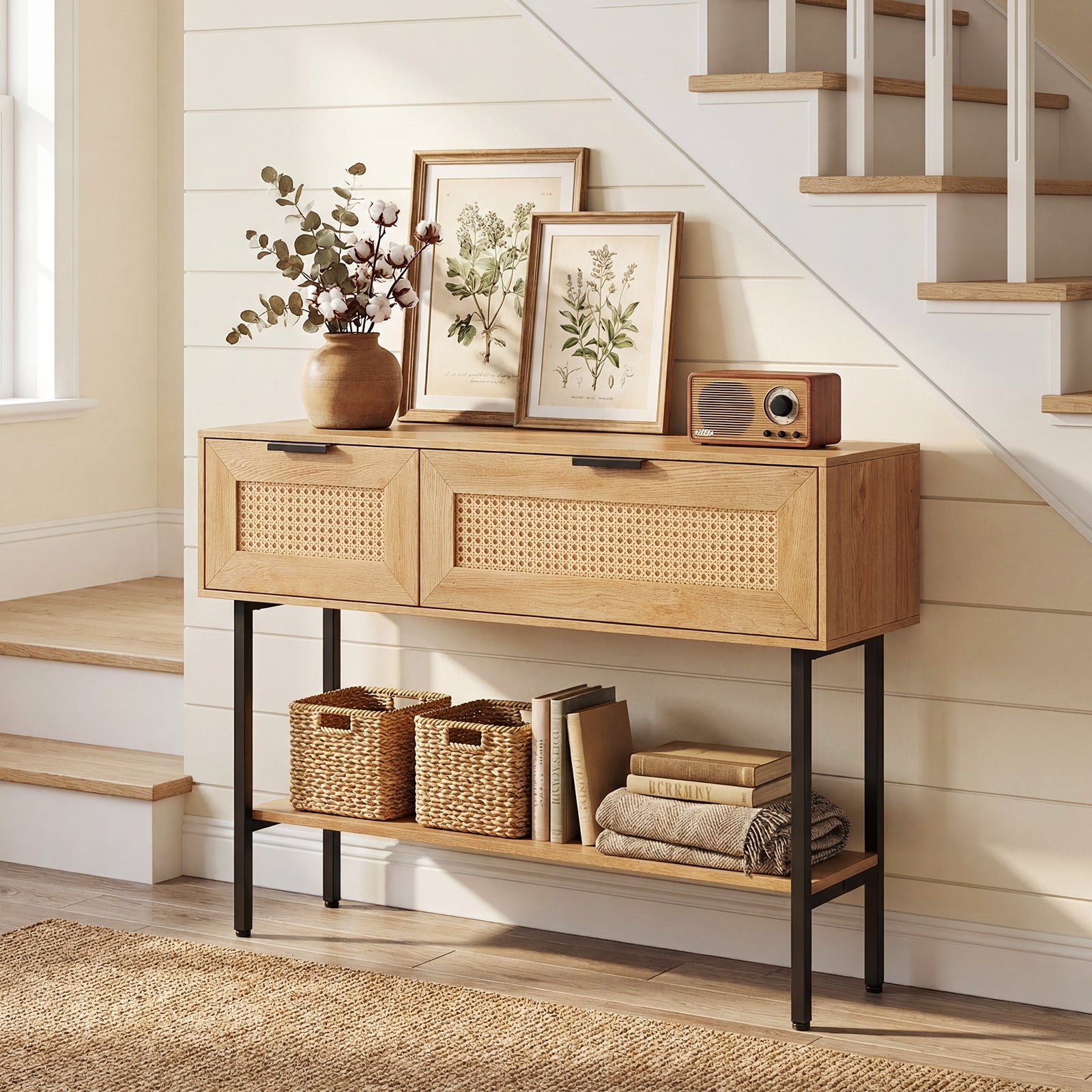 ● Enduring & Elegant PE Rattan: Crafted with well-woven PE rattan this entryway table delivers both elegance and lasting performance. The anti-fading and tear-proof material ensures the piece maintains its beauty over time.