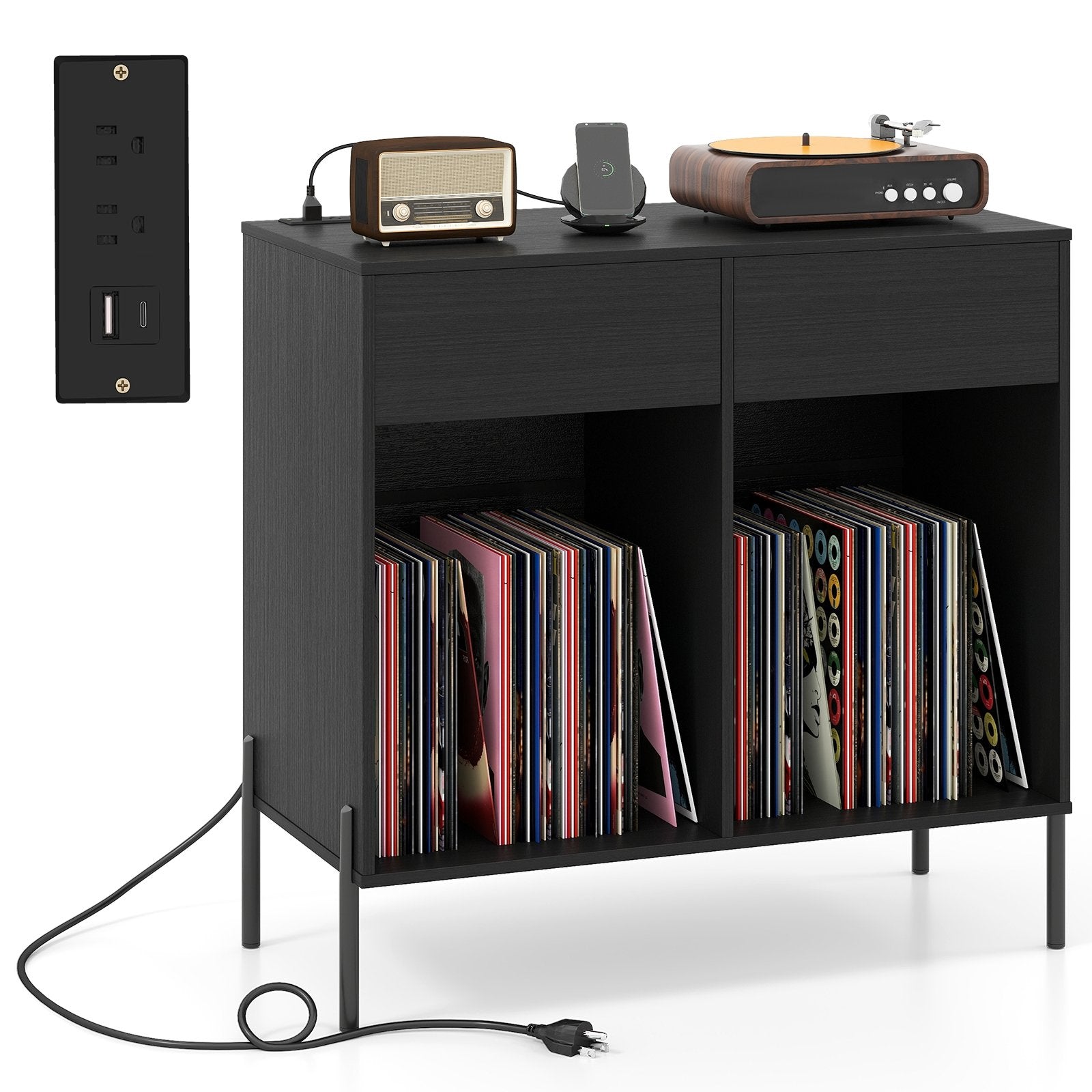 Record Player Stand with Power Outlets Double Wide Turntable Stand Vinyl Record Storage Table-Black