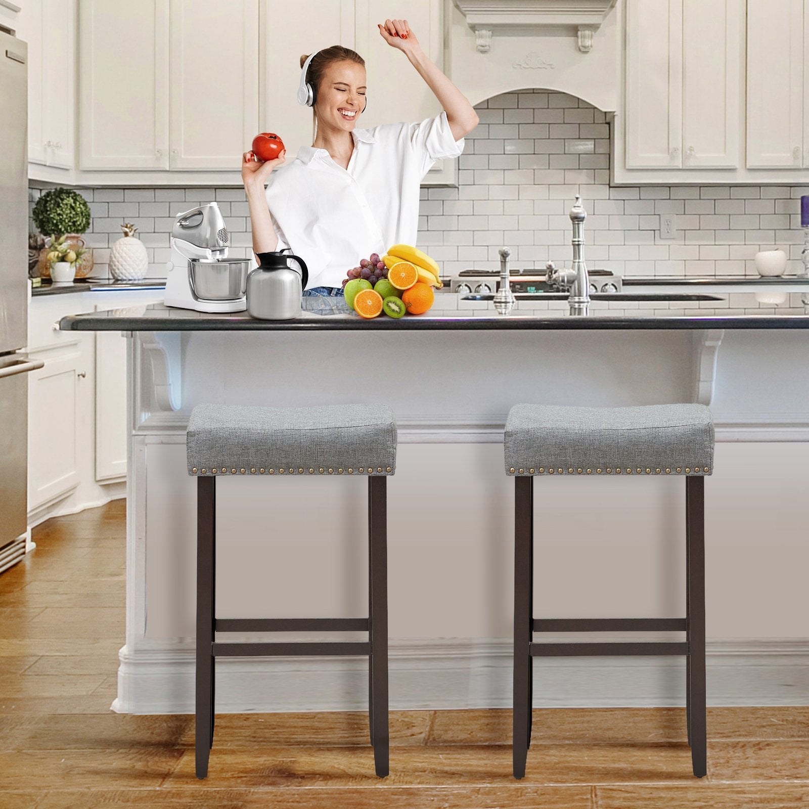 Made of solid rubberwood and MDF construction these stools provide you years of durable use. The seats are firmly cushioned and equipped with the mixed linen and cotton fabric upholstery. Ergonomically saddle shape pluses feet pedals for much comfort. Classic nailhead studs are set around the stools revealing the royal atmosphere. What’s more these upholstered stools are pretty easy to assemble with this easy-to-follow instruction. With simple and elegant design these stools are compatible with your home bars office etc.