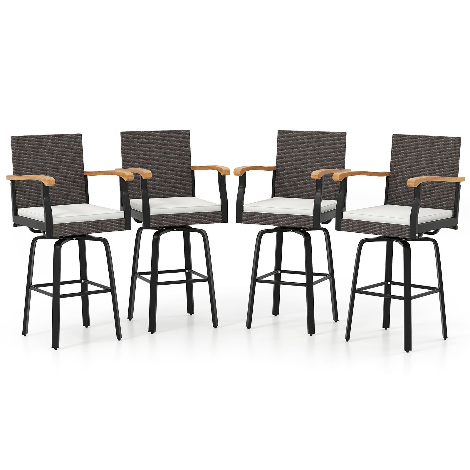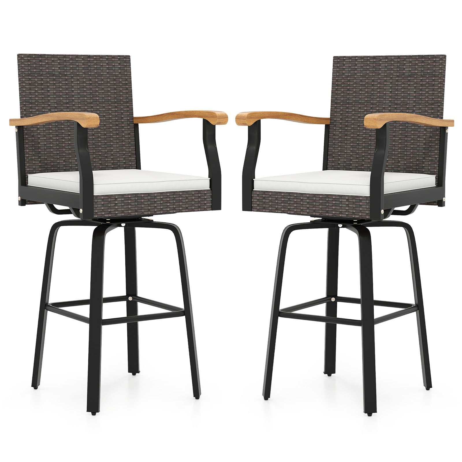 Set of 2 Outdoor 360° Swivel Bar Stool with Cushion and Acacia Wood Armrests