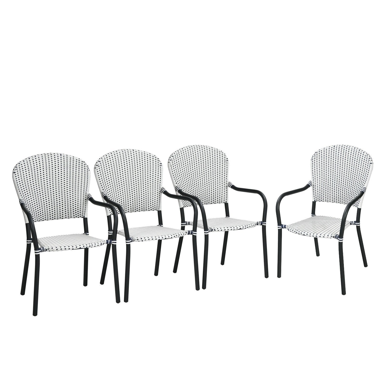 These stacking chairs are a great addition to different outdoor places such as poolside garden backyard and patio etc. If the guests come to visit your home you can entertain them with these four chairs. When they leave you can stack these chairs to save space. Made of weather-resistant PE rattan and heavy steel frame this outdoor dining set is durable and stable to hold up to 330 lbs for each chair.