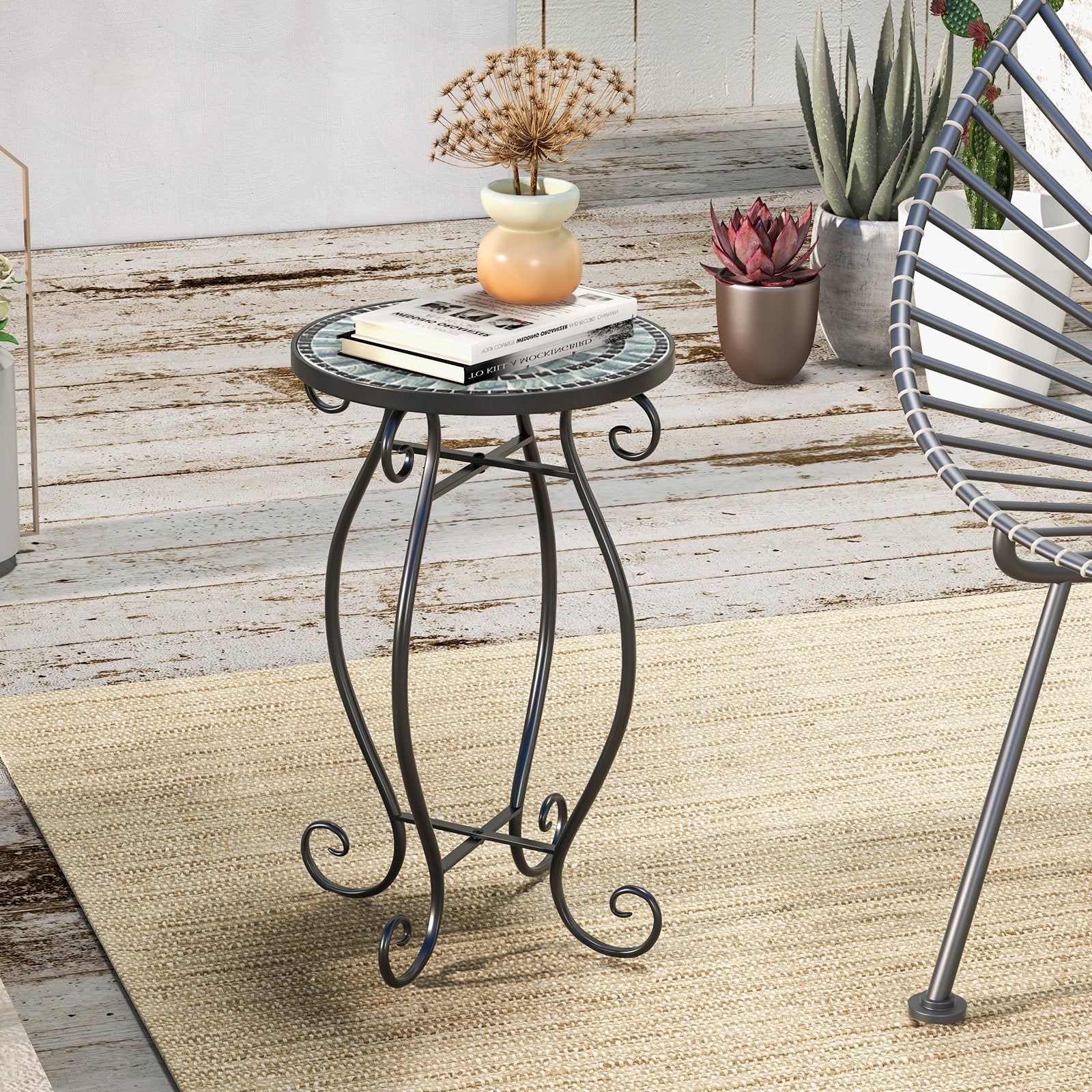 Small Plant Stand with Weather Resistant Ceramic Tile Tabletop-Black & Smoke Blue