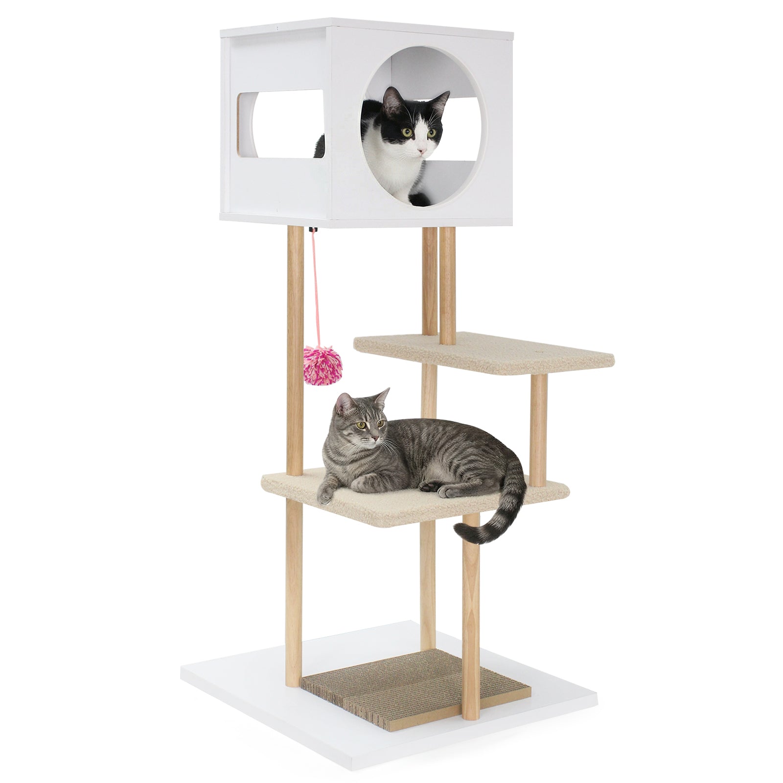 Tall Wood Cat Tower with 2 Corrugated Cardboard-White