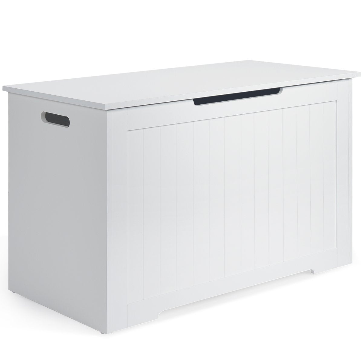 With 44 lbs bearing capacity you can put the kid's toys in this large storage space and make the room more tidy. It is carefully designed with a groove at the front edge to prevent fingers from being pinched. 2 holes on sides make it easy to lift the box and move it to the place needed. Flip-top lid provides convenient opening for taking out or putting in items saving your energy. It is high-quality made of durable and safe MDF material for long service life.