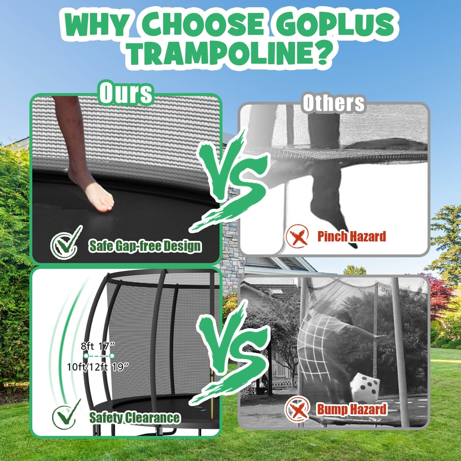 ● More Stable and Better Bounce: Made of high resilient PP jumping mat and high strength steel springs (3.2 mm wire diameter) the trampoline creates exciting jumping for the entire family. Our 10ft trampoline has 4 legs while most 10ft trampolines have only 3 legs and all sizes of trampoline can hold up to 400 lbs.