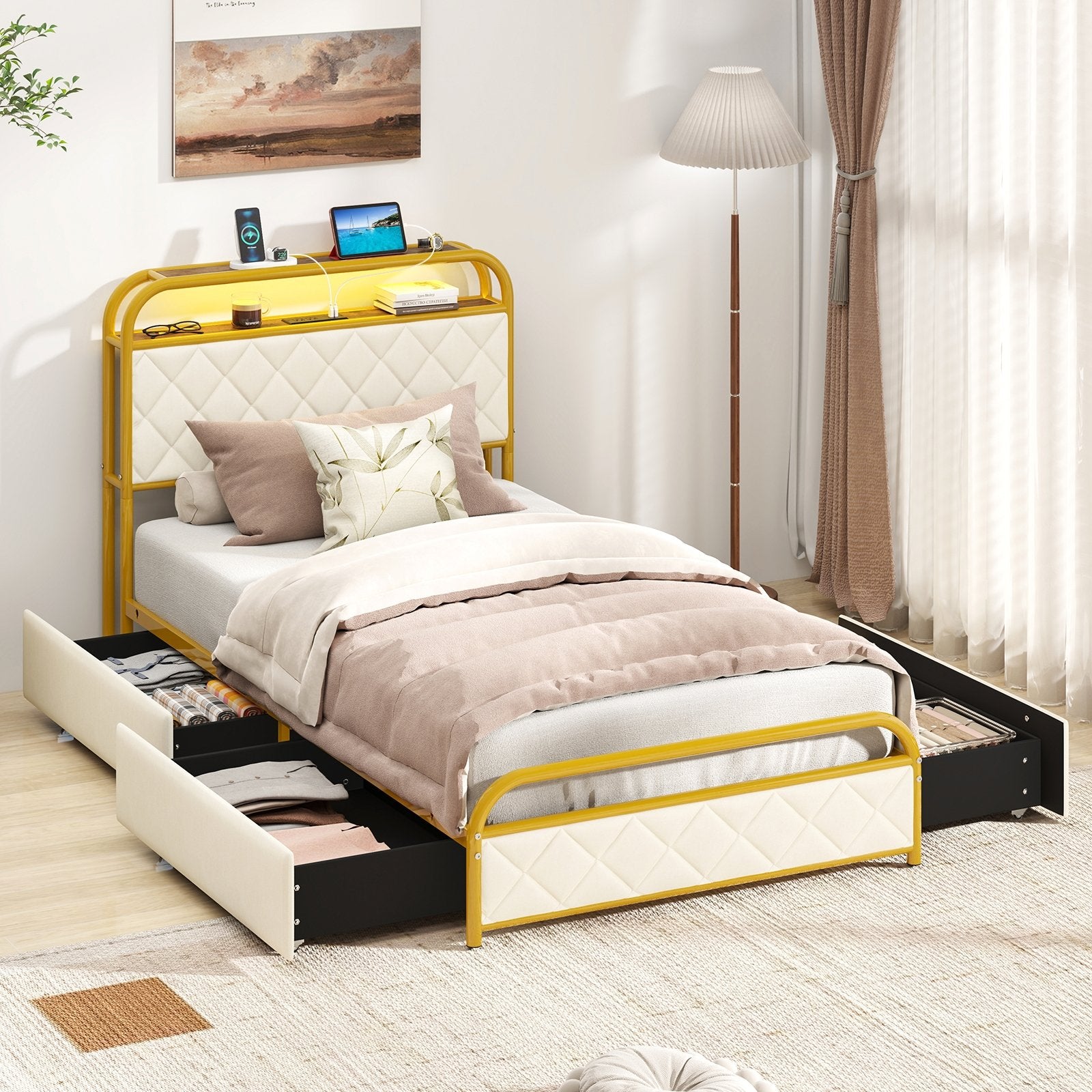 Twin/Full/Queen Size Bed Frame with LED Lights and Charging Station Gold-Full Size