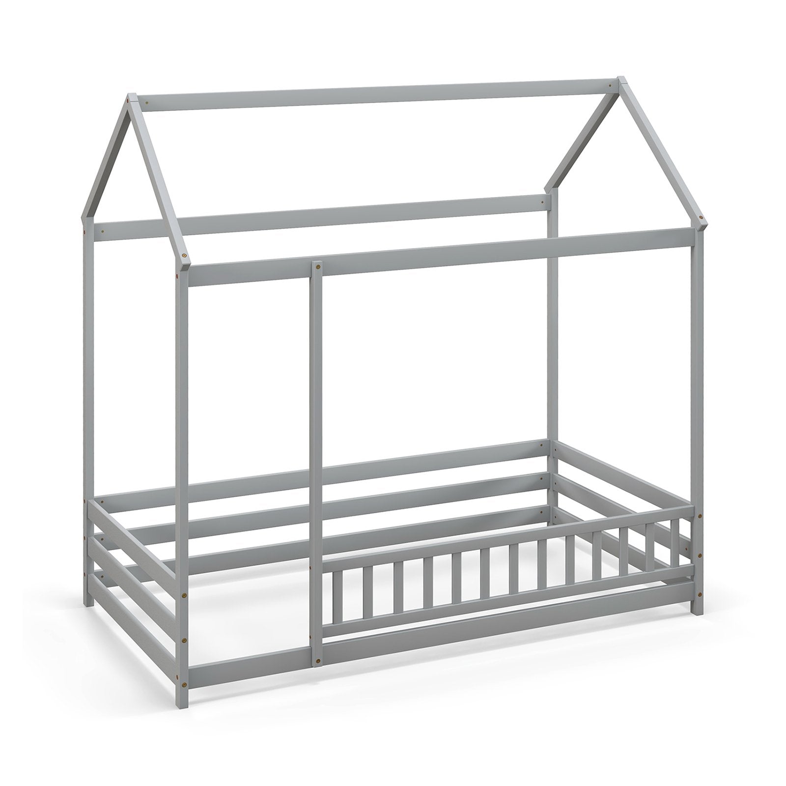 Twin Size Kids House Bed Wooden Floor Bed with Roof and Full-length Safety Guardrail-Gray