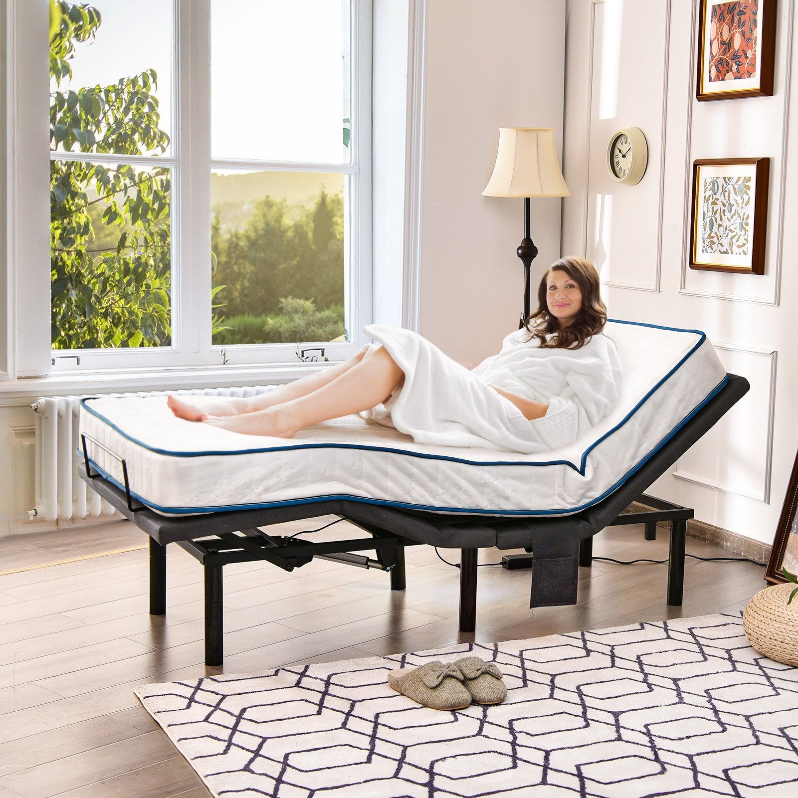 It is made of high-quality materials and components. This adjustable bed features 4 massage modes for your preference and vibration massagers on the head and foot to relax your body. Wireless remote with various settings allow you to adjust the position for activities you may do in bed such as reading watching TV or working. The adjustable bed provides restful sleep relieves body and joint pain and reduces moderate snoring. There are USB ports on each side of the bed frame for convenient use.