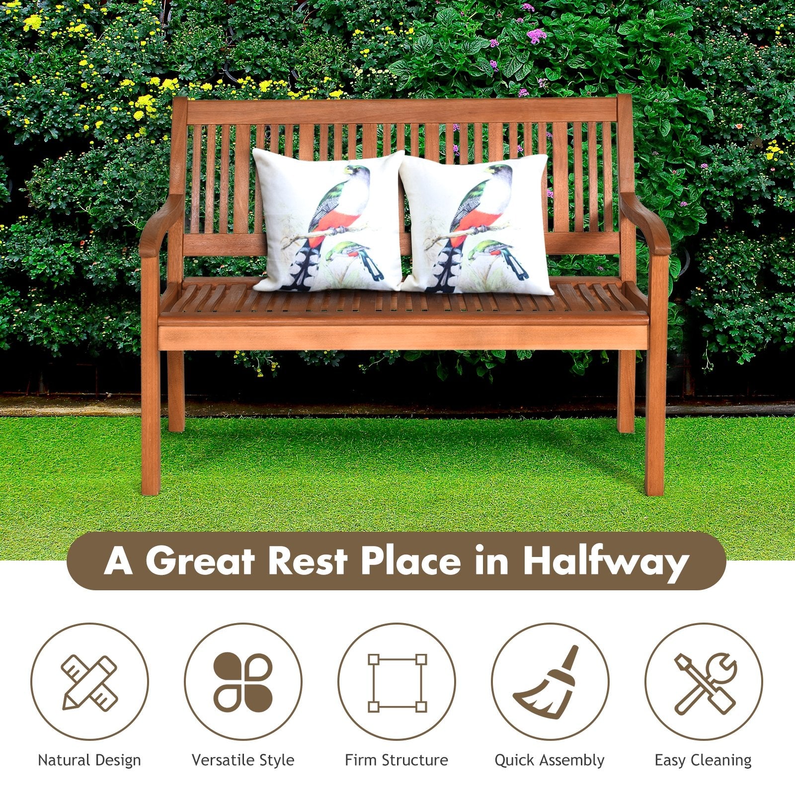 ● 100% Solid Wood Frame: Made of natural and premium eucalyptus this outdoor bench is not easy to be affected by humidity change and lead to crack. The surface of the bench is painted with varnish which ensures the function of waterproof and scratch resistant.