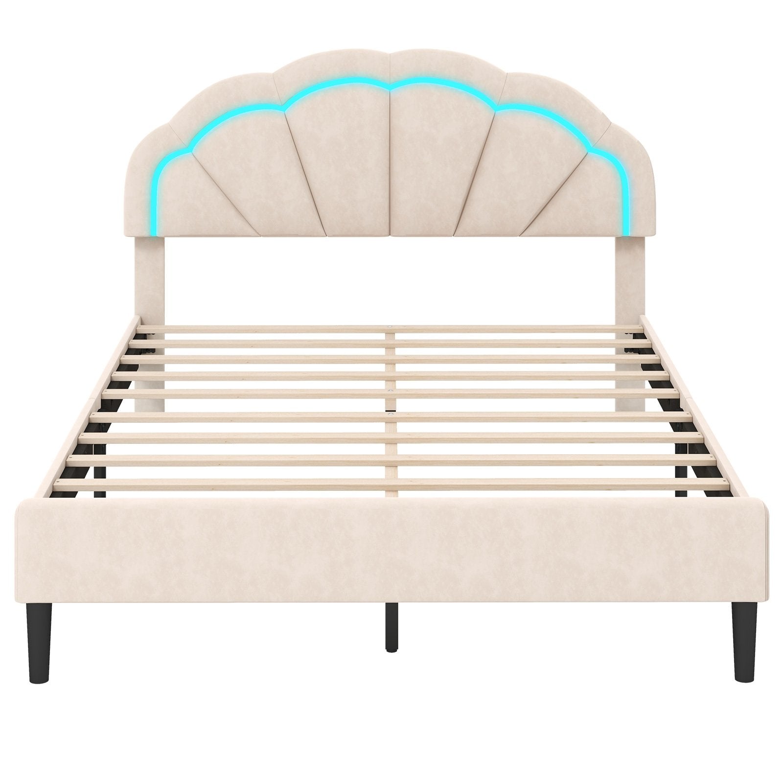 Upholstered LED Bed Frame with Adjustable Flower Headboard and Metal Support Feet-Queen Size
