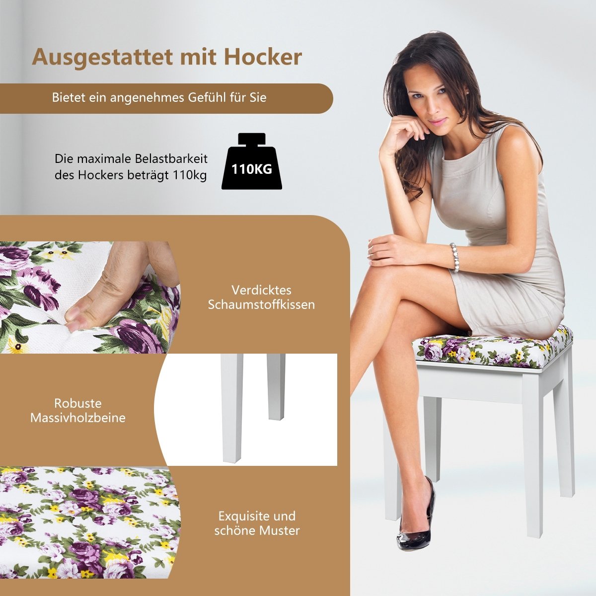 ● An Elegant and Comfortable Stool Provided: Made of breathable fabric and high-density sponge that doesn't collapse easily this cushioned stool provides a more comfortable makeup environment. The stool with flower-patterned adds elegance and glamour perfect for use as a piano bench shoe bench or footrest.